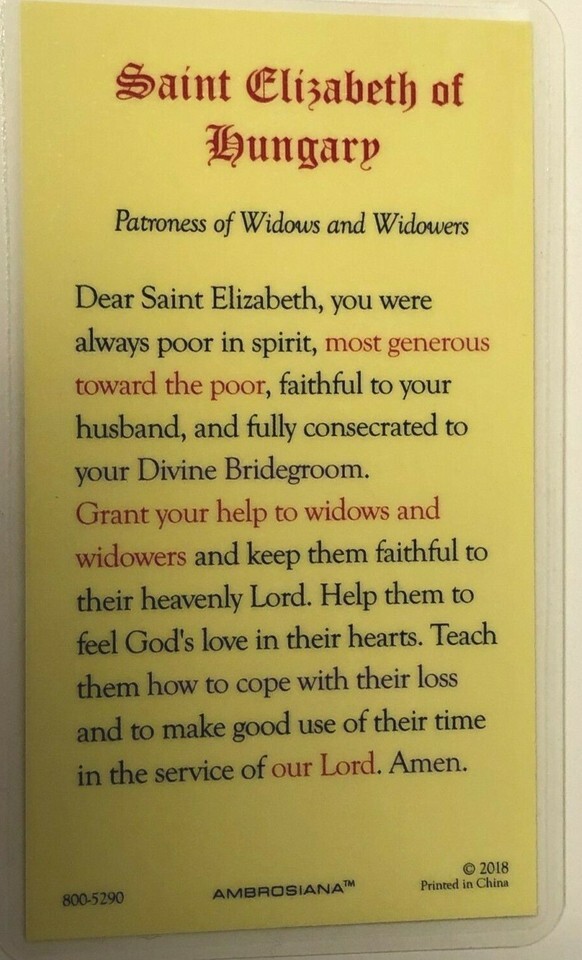 You are purchasing a laminated prayer card of Saint Elizabeth of Hungary. Patron Saint of the widows widowers. Come from the Abrosiana Collection. Approximate measurements: 4.25 " X 2 .75"
