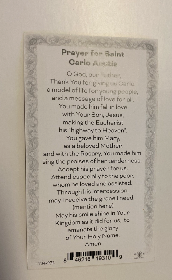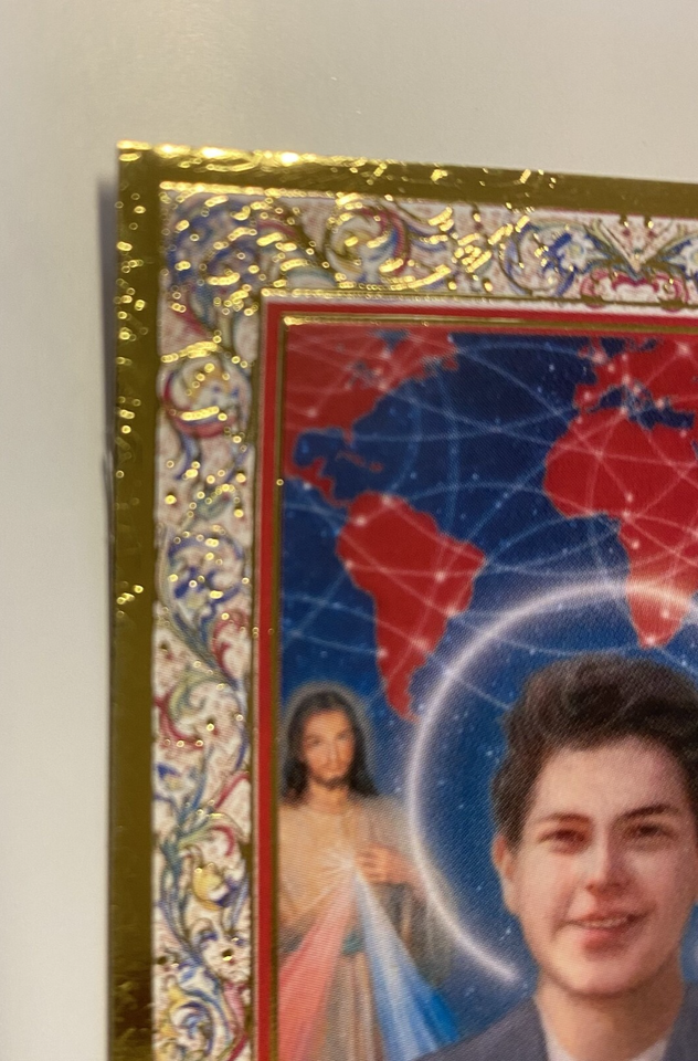 You are purchasing a very nice prayer card with a gold a trim on it on Saint Carlo Acutis.