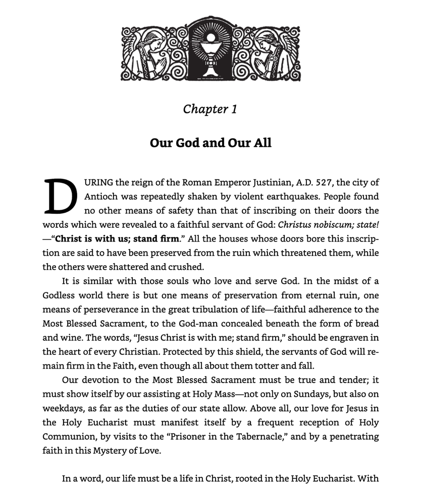 An invitation for all in order to develop an ever deepening love for Jesus truly present in the Blessed Sacrament. Fr. Etlin explores many aspects of this the greatest mystery of the Catholic Faith. He considers the Most Blessed Eucharist as life, as food, as expiation, as salvation, as the treasury of grace and as Divine Love. Reads like a Fr. Paul O'Sullivan book! Impr. 79 pgs, PB