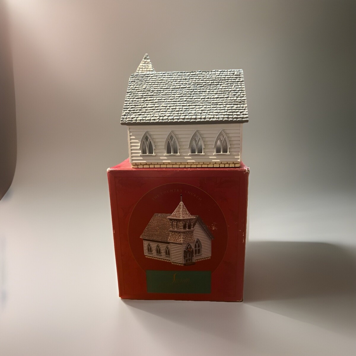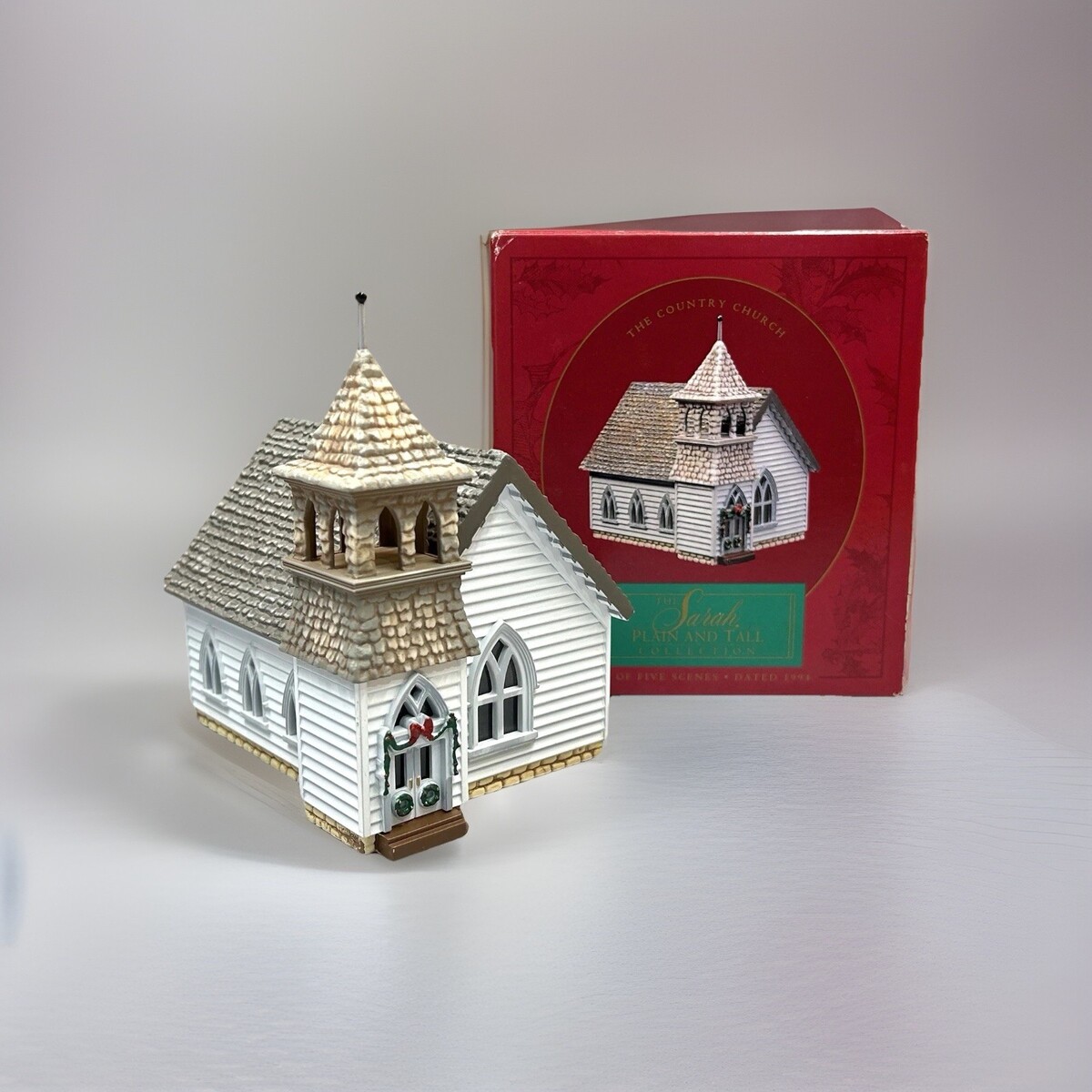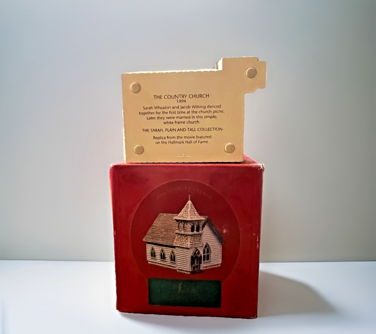 The product is a HO Scale Hallmark decorative collectible from the Sarah Plain and Tall Collection of 1994. It is a country church replica made of synthetic material in multi-color, featuring a Americana style. The collectible is free-standing and original, representing post-1940 era. box has wear from age item is in very nice condition