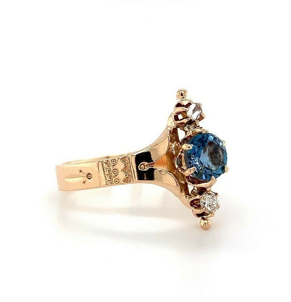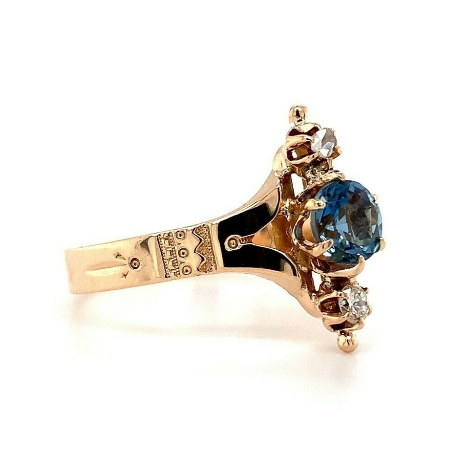 10k yellow gold ring featuring a round genuine aquamarine weighing .48cts and measuring about 4.9mm. The aqua has great medium blue-green color. There are two antique diamond accents measuring about 1.8mm (one is rose cut and the other is European cut).