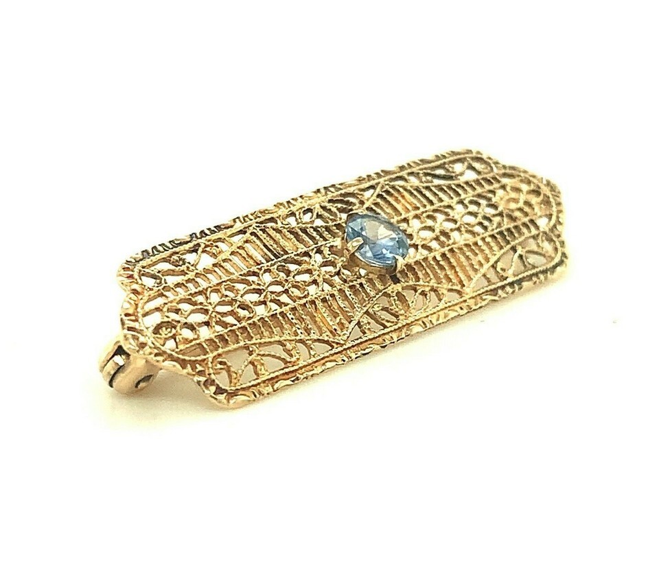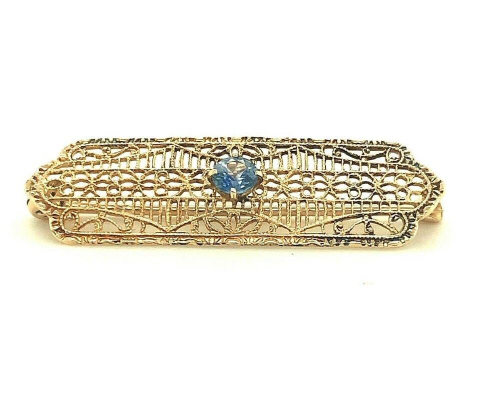 Art Deco 10k yellow gold filigree pin featuring a genuine earth mined blue sapphire. The pin measures about 1 3/8" long and 1/2" wide. The medium blue round sapphire measures about 3.5mm and weighs .27cts. The pin weighs 1.0 dwt., and dates from the 1920s. It is a little more rose gold color in person. Lovely!