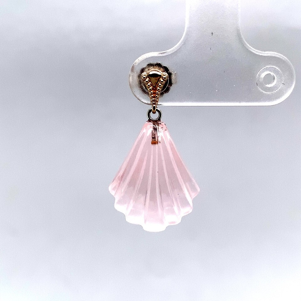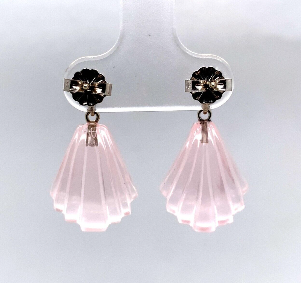 14k white gold rose quartz drop earrings featuring specially carved fan or shell shaped stones. These are hand carved stones and are a nice light pink color, but the carving is not identical. The earrings measure 1" long with post and friction backs. The rose quartz stones measure about 16.5mm x 13mm.