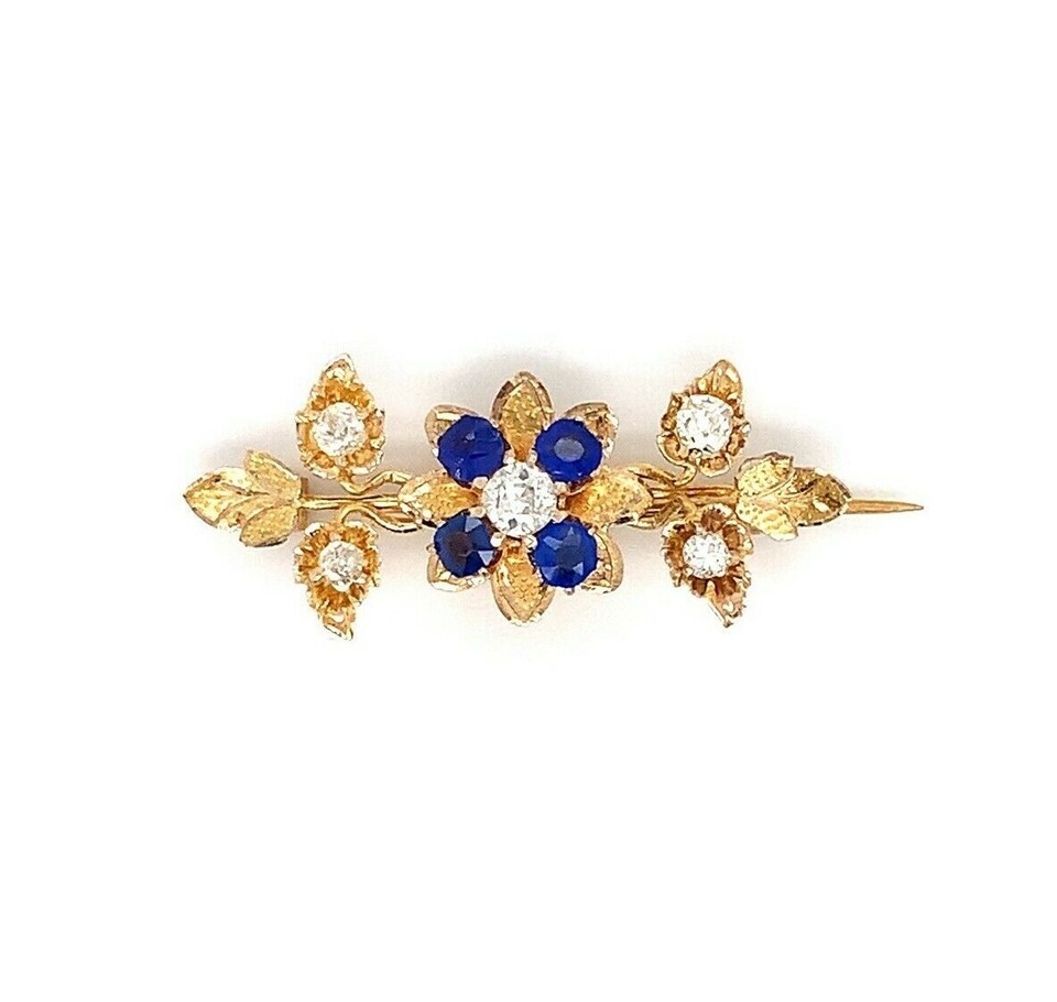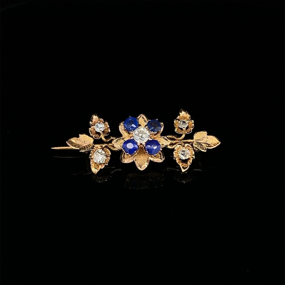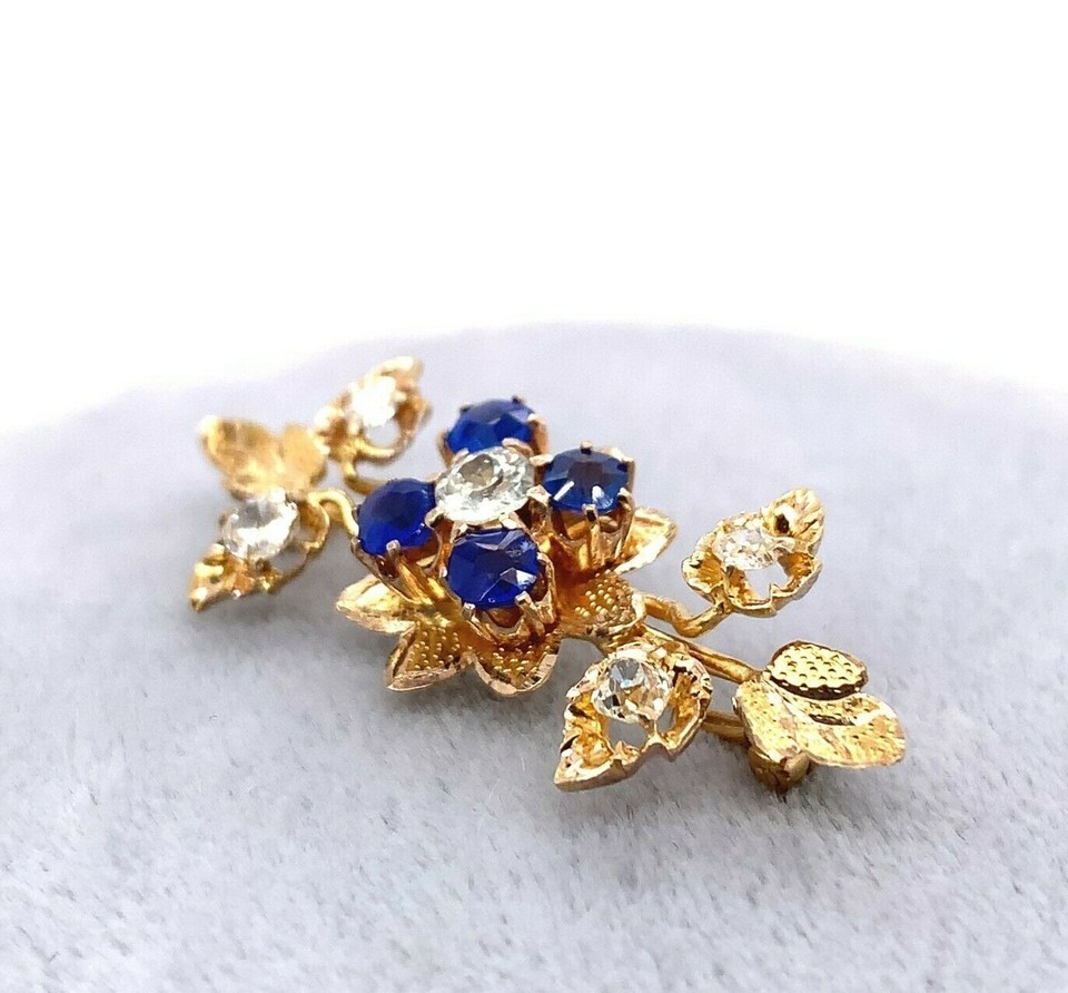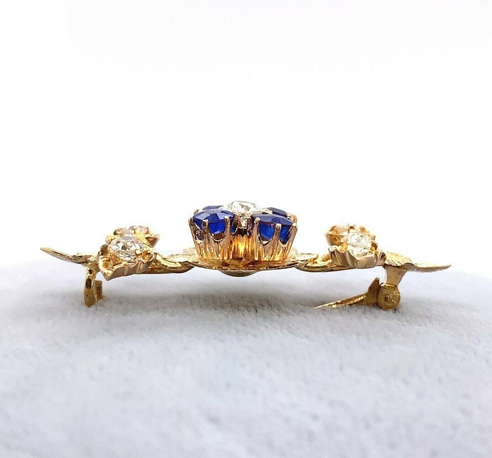 10k yellow gold hand made diamond flower pin featuring mine cut diamonds. The center diamond measures about 3.5mm, and the smaller diamonds measure about 2 to 2.5mm. One of the 2mm diamonds is European cut. There are four mine cut original blue doublet stones in the center.