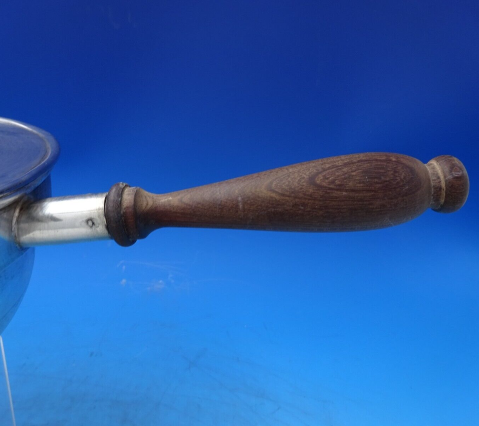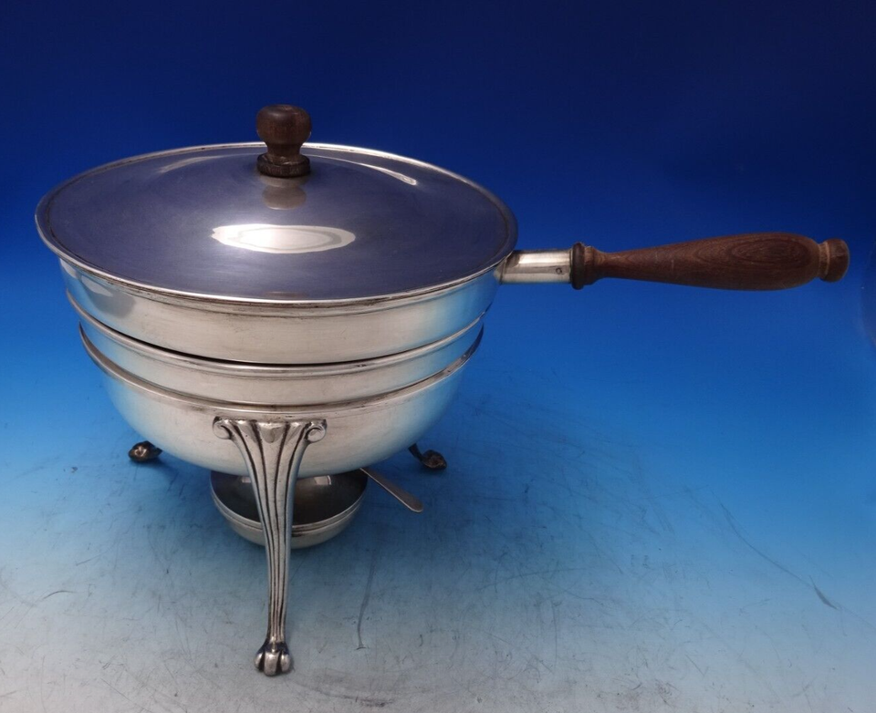 Wonderful ACN Mexican sterling silver chafing dish with bowl and burner with wood handle and finial. This piece measures 10 1/2" tall x 15 1/2" long (with handle) x 9 3/4" deep (bowl) and weighs 98.8 troy ounces. The pieces are not monogrammed and are in good estate condition as shown in the photos, with some wear to the wood as expected with age. Superb!