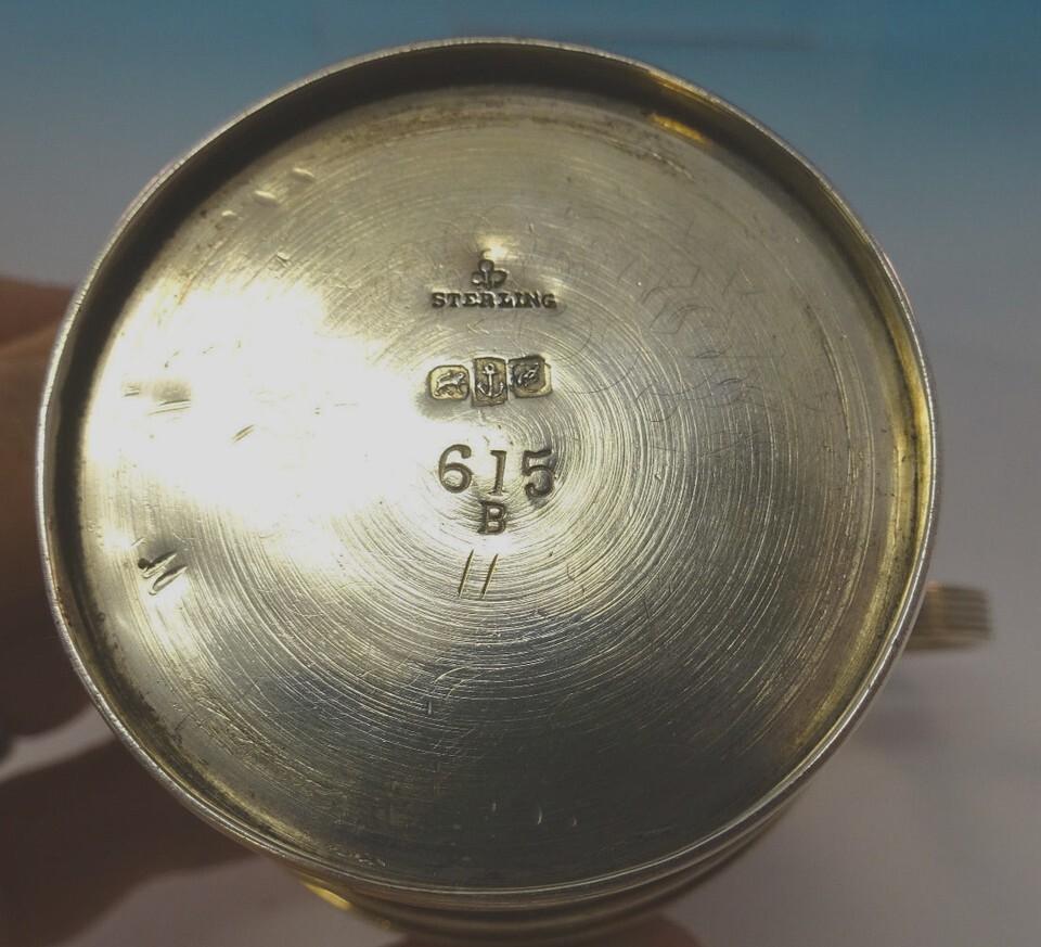 The swing handle Sugar bowl measures 2 1/2" tall x 5" wide and weighs 3.68 troy ounces.