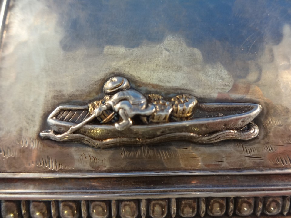 figure with sword, applied silver Japanesque figure in boat, and applied gold