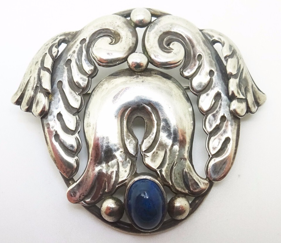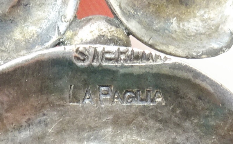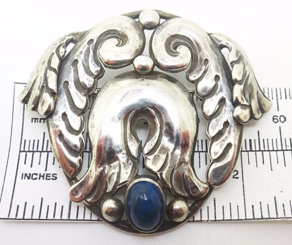 Wonderful sterling handwrought pin made by International and designed by Alphonse La Paglia. The pin features an oval Labradorite measuring 9.5mm x 7.1mm. The pin measures 53mm x 59mm or 2" x 2 1/8". It weighs 16.8 dwt., and dates from 1930-1940s. Exceptional!