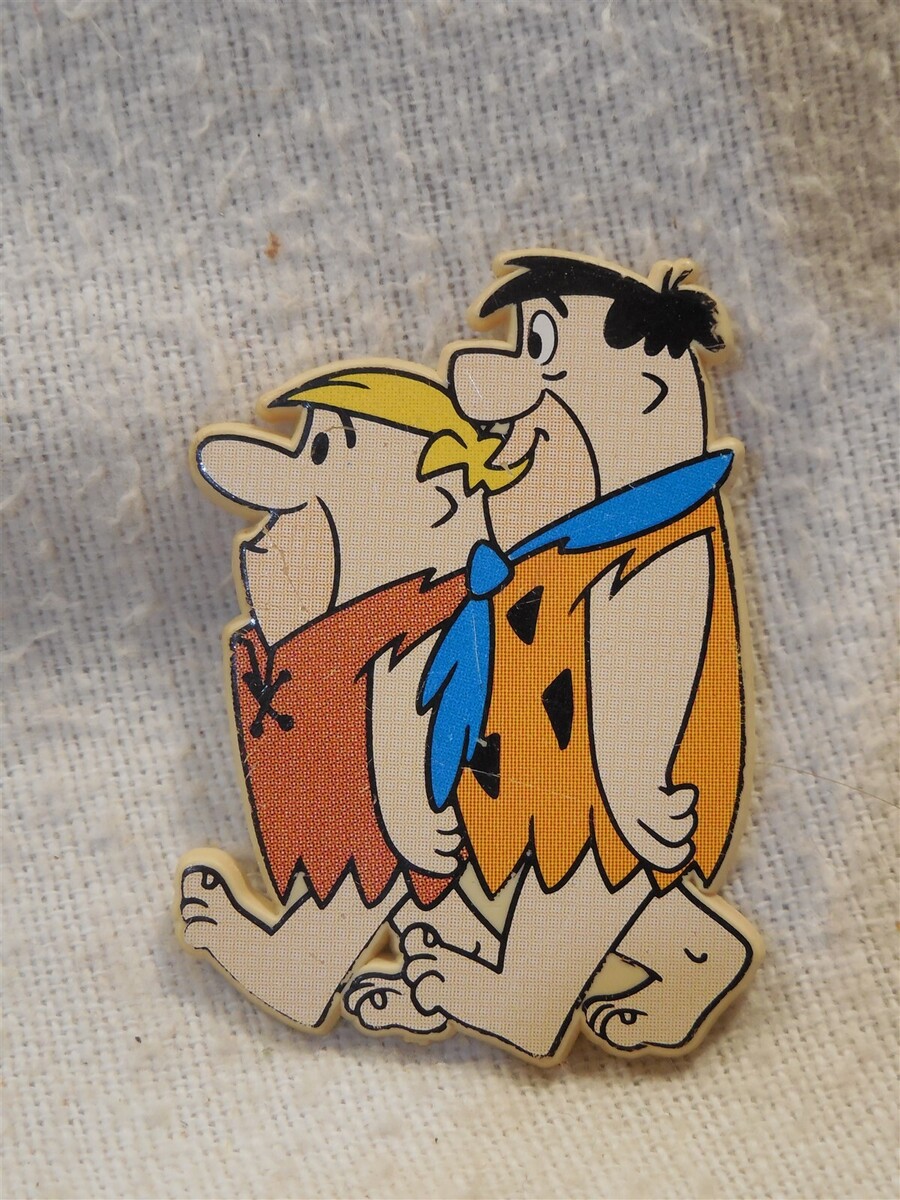 This is a Flintstones 1994 HBP clasp back plastic pin. The pin pictures Fred Flintstone and Barney Rubble walking. It is approximately 2" tall. The actual pin on the back is metal. The metal clasp is intact.