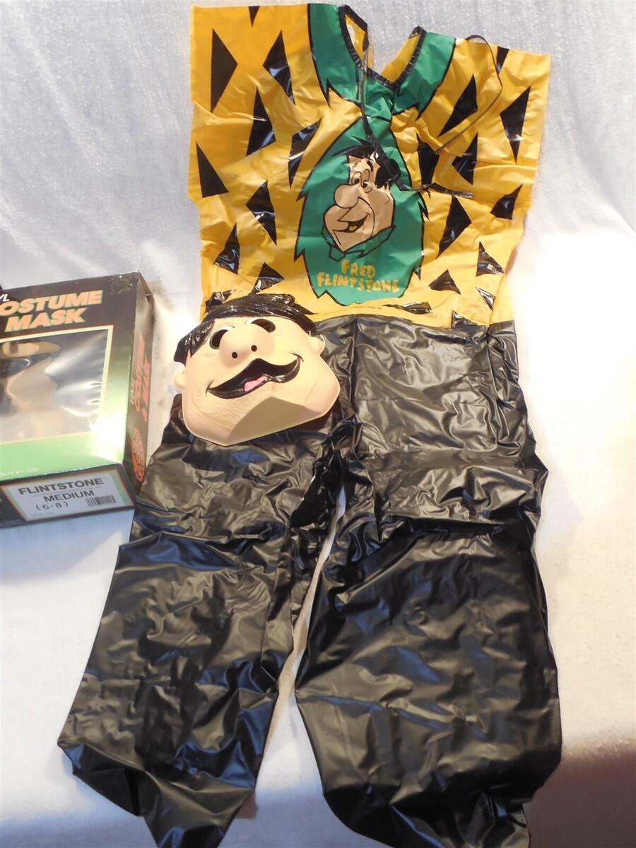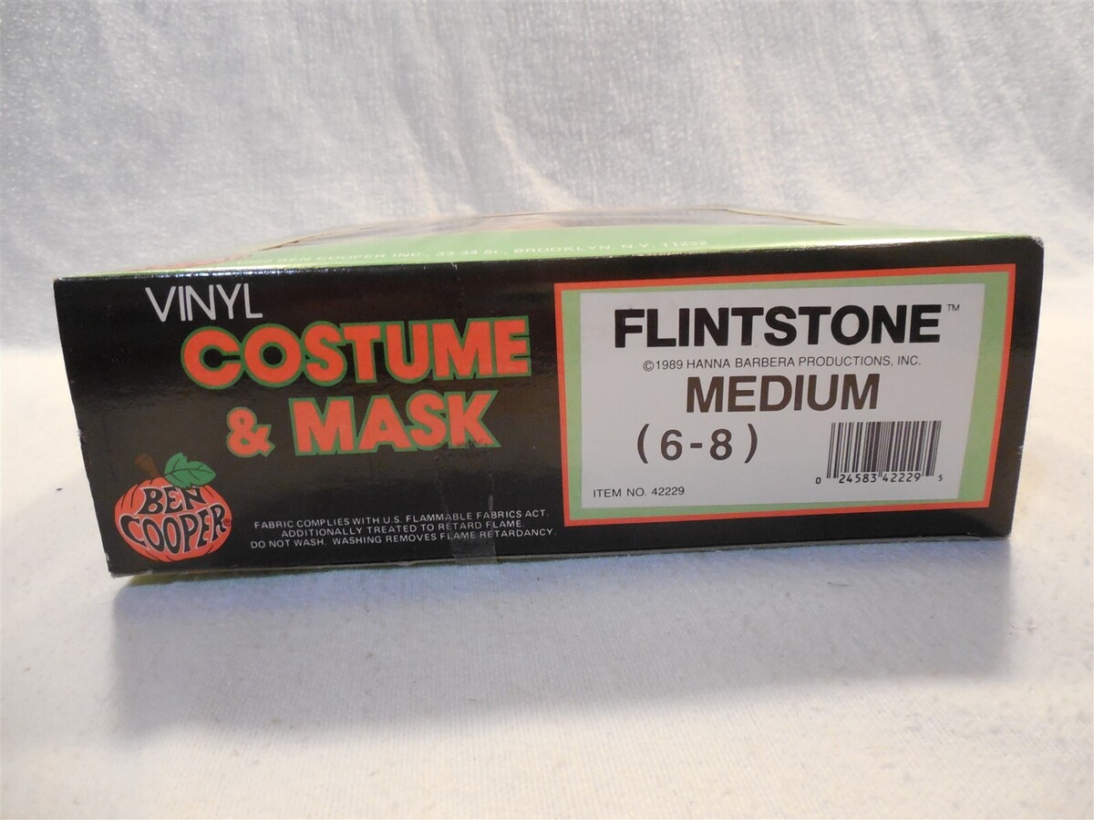 This is a 1989 Ben Cooper Original Fred Flintstone Halloween costume, number 42229. The costume is complete in original box. There is a Fred face plastic mask and a vinyl outfit. The box is marked as size medium (6 to 8). The box measures approximately 8 1/2" x 11 1/4" x 3". The vinyl outfit is the 1973 outfit that was used over the years. The mask still has the paper tag attached.