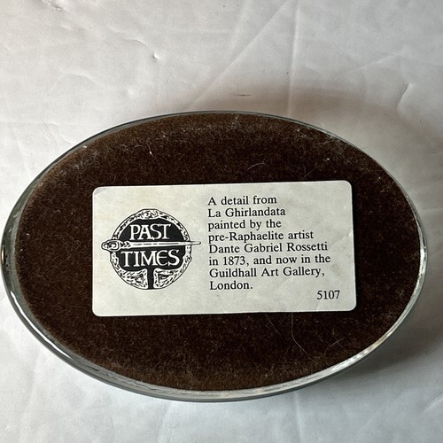 This vintage paperweight by Past Times features the beautiful La Ghirlandata design by Dante Gabriel Rossetti. Measuring 3x4 inches, it is a perfect addition to any collection of decorative collectibles. The country/region of manufacture is unknown, adding to its mystery and allure. This item falls under the categories of paperweights and collectibles, and is sure to be a conversation starter in any room.