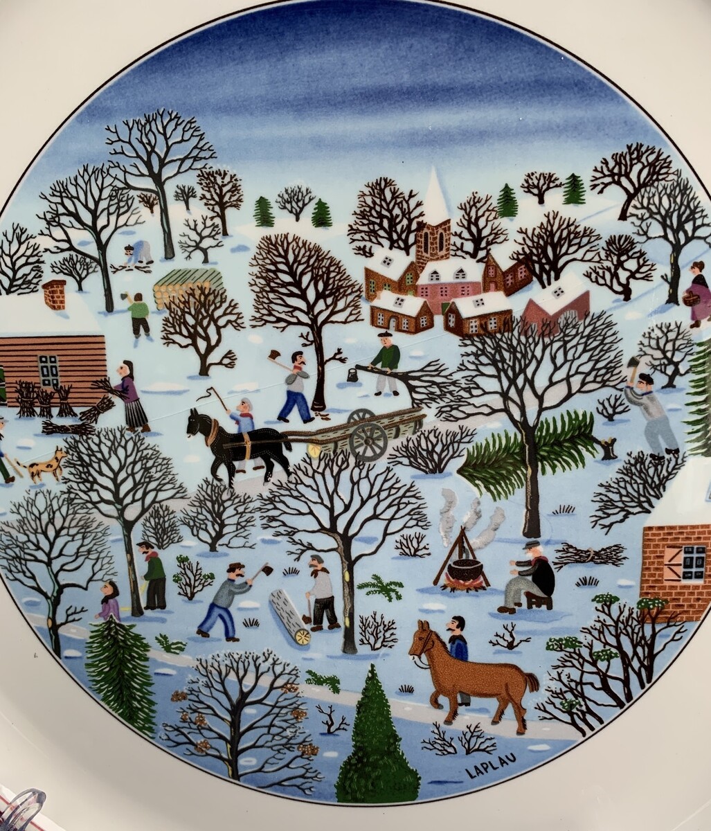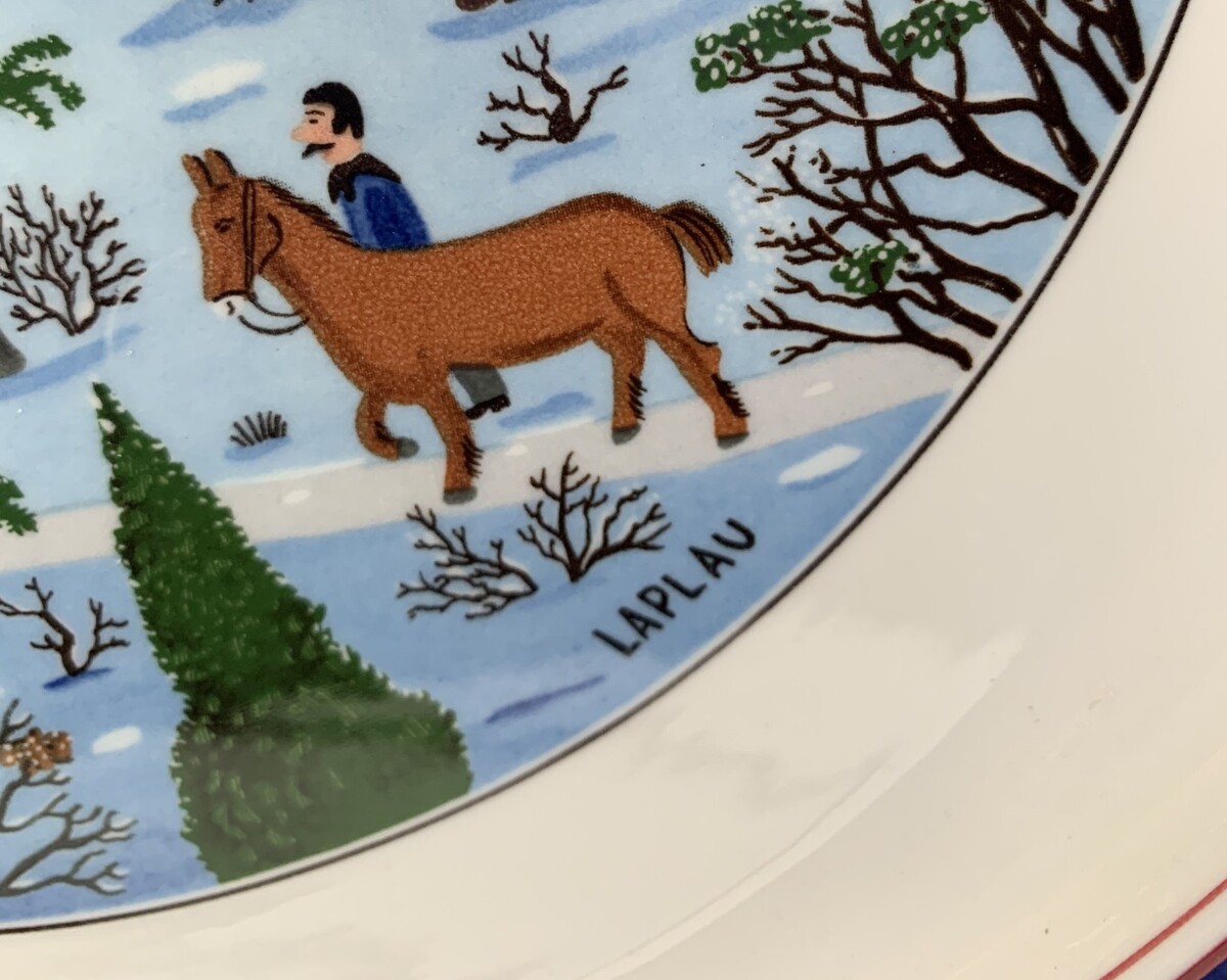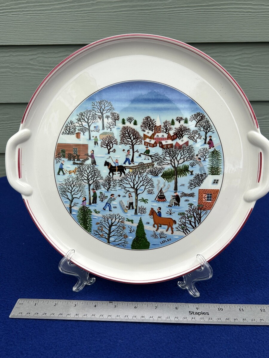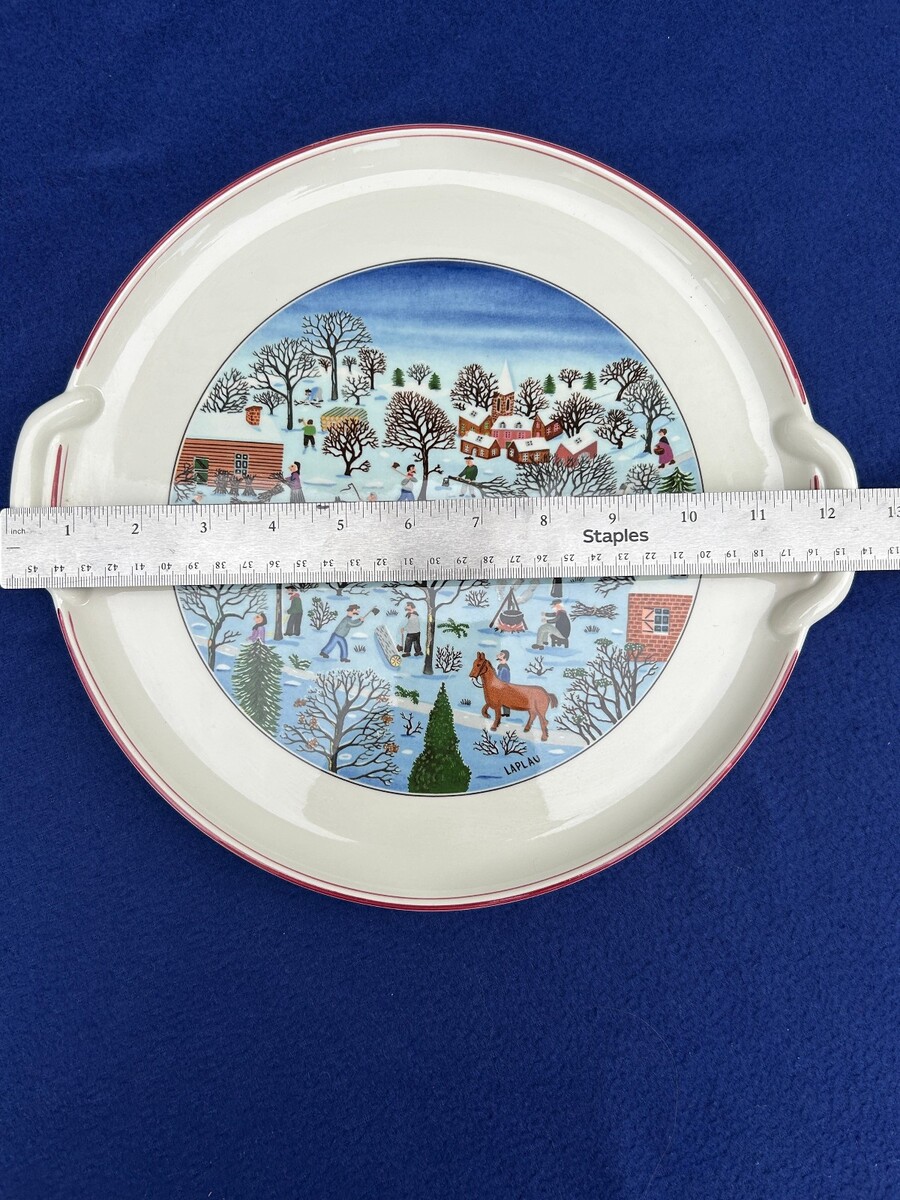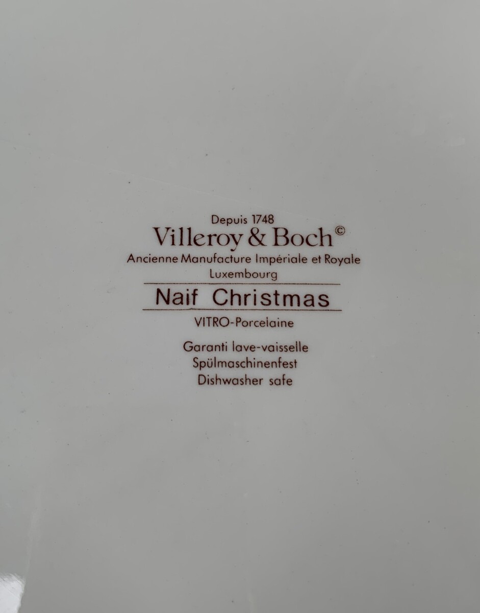 Villeroy Boch Naif Christmas, Luxembourg, 12 1/2' x 11 5/8" perfect except tiny 1/8" chip or burst bubble on the bottom of the foot, (smooth not raggedy, manufacturing defect?), no scratches or color loss.