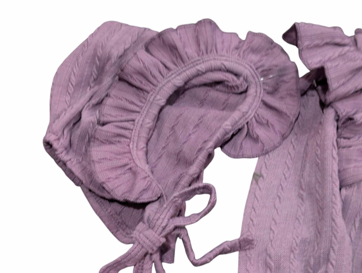 This is an absolutely adorable Vintage inspired infant girls dark lavender romper. Cable knit pattern. It comes with a bonnet. Light to midweight outfit. Not super thick. Size 6 to 9 months. Brand new without tags.