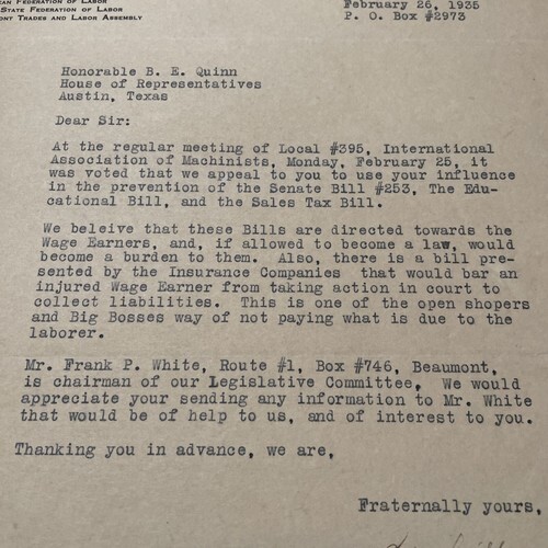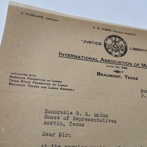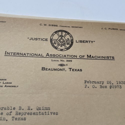 International Association of Machinists letter 1935 Signed C. W. Gibbs.