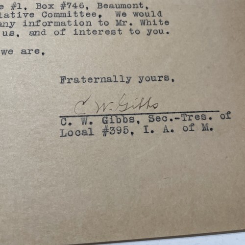 International Association of Machinists letter 1935 Signed C. W. Gibbs
