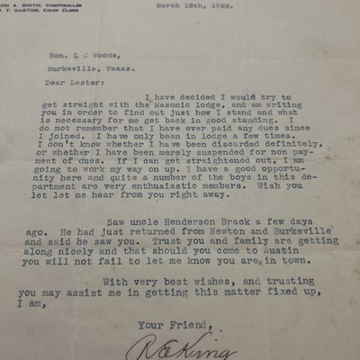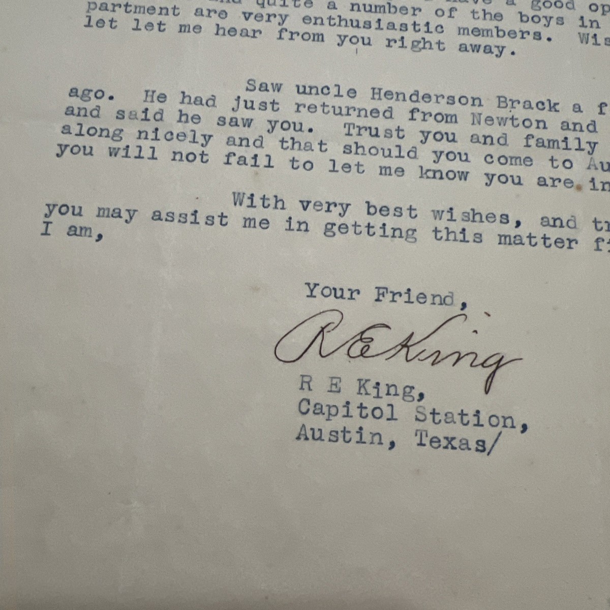 Letter Capitol Station Austin Texas 1922 Masonic Letter R.E. King