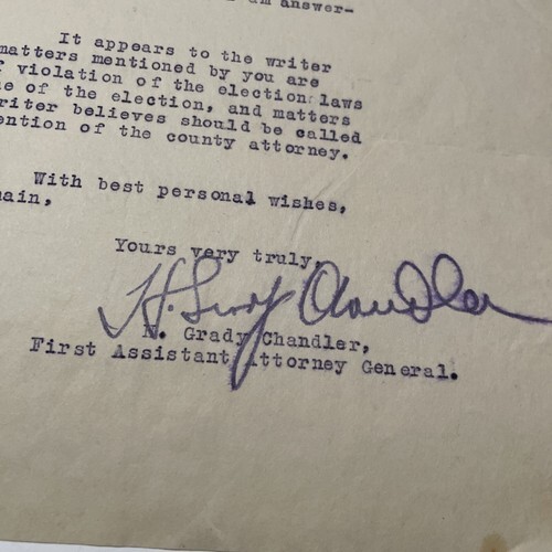 I have been unable to find biographical information about H. Grady Chandler, letter states his position as First Assistant Attorney General.
