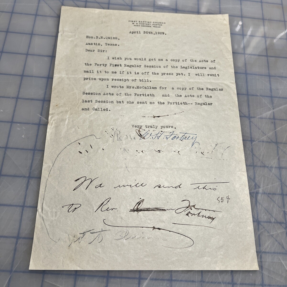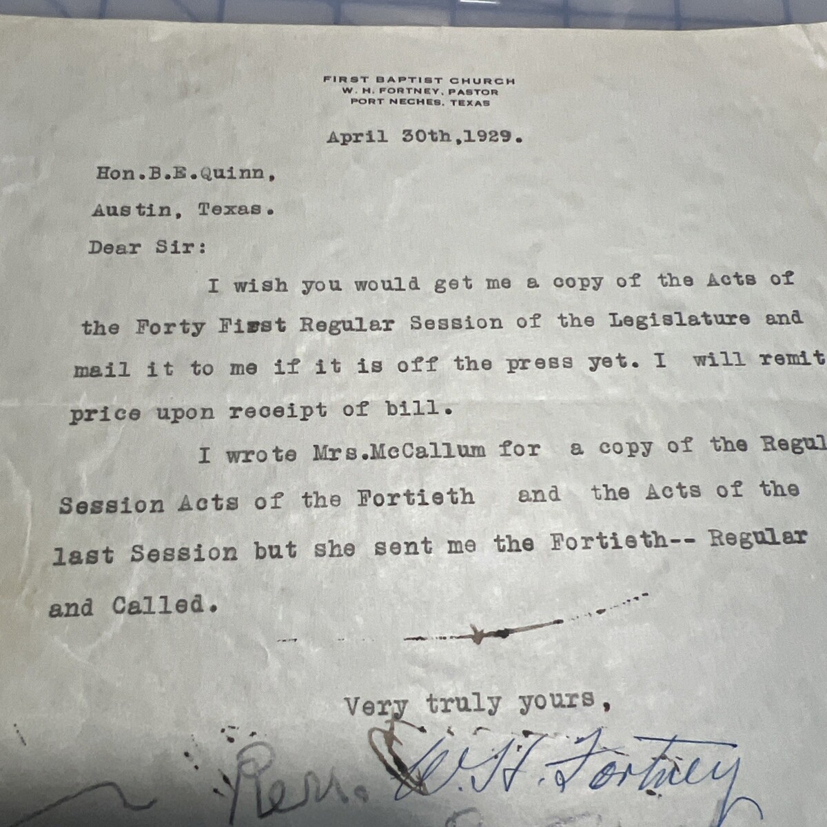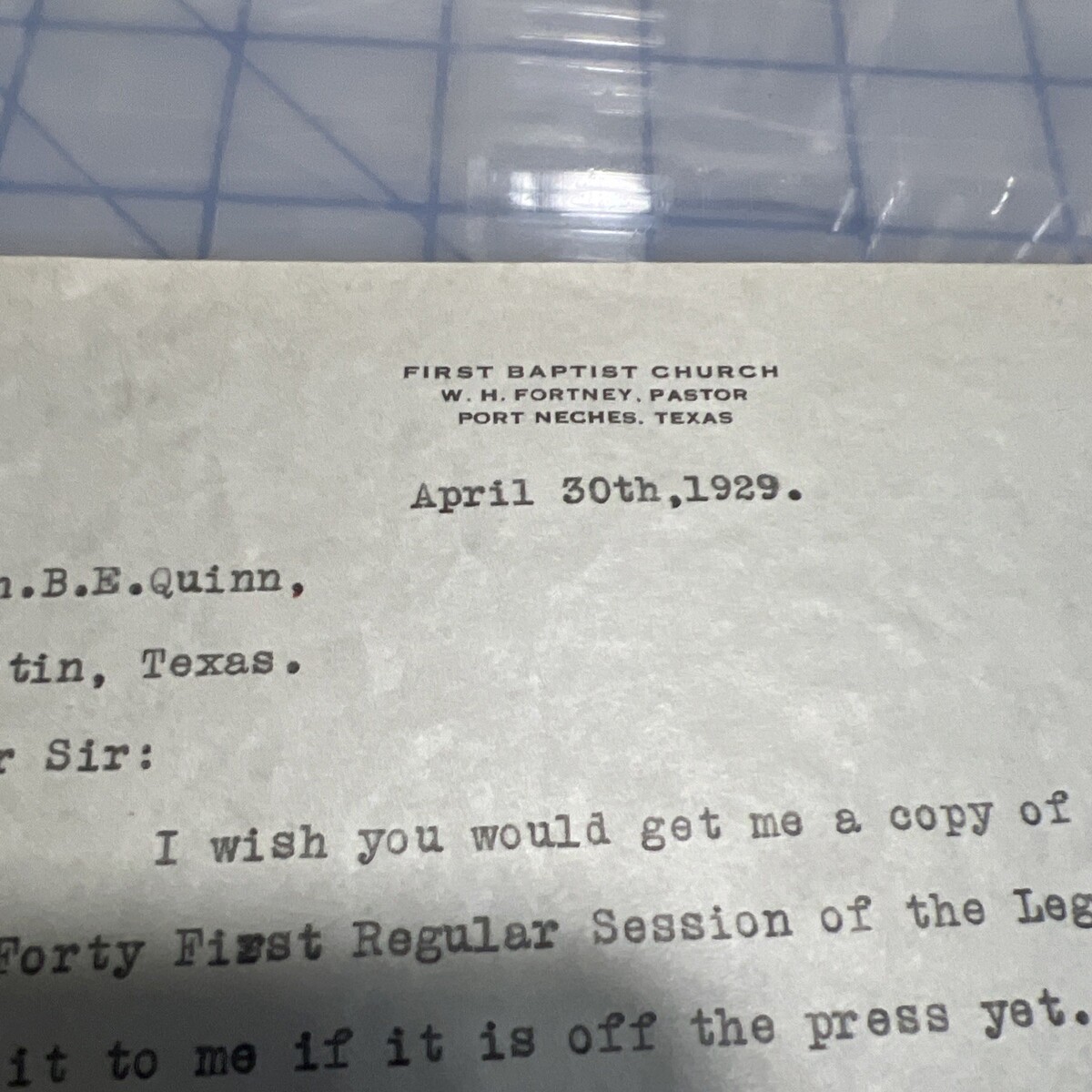 Antique Letter First Baptist Church Port Neches Texas Signed Pastor W.H. Fortney