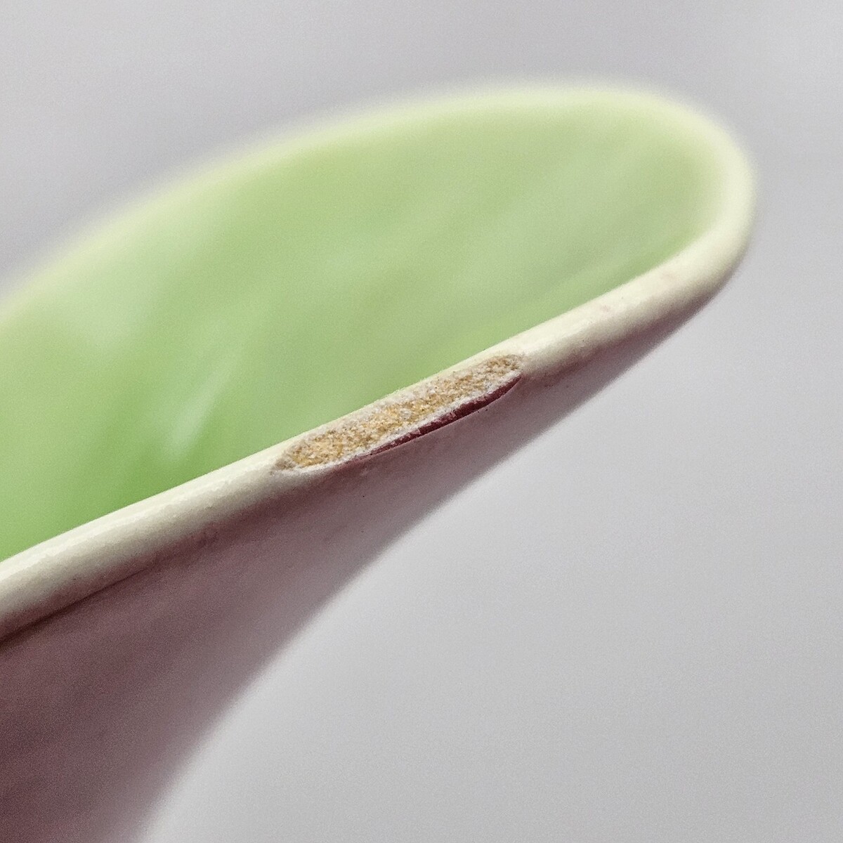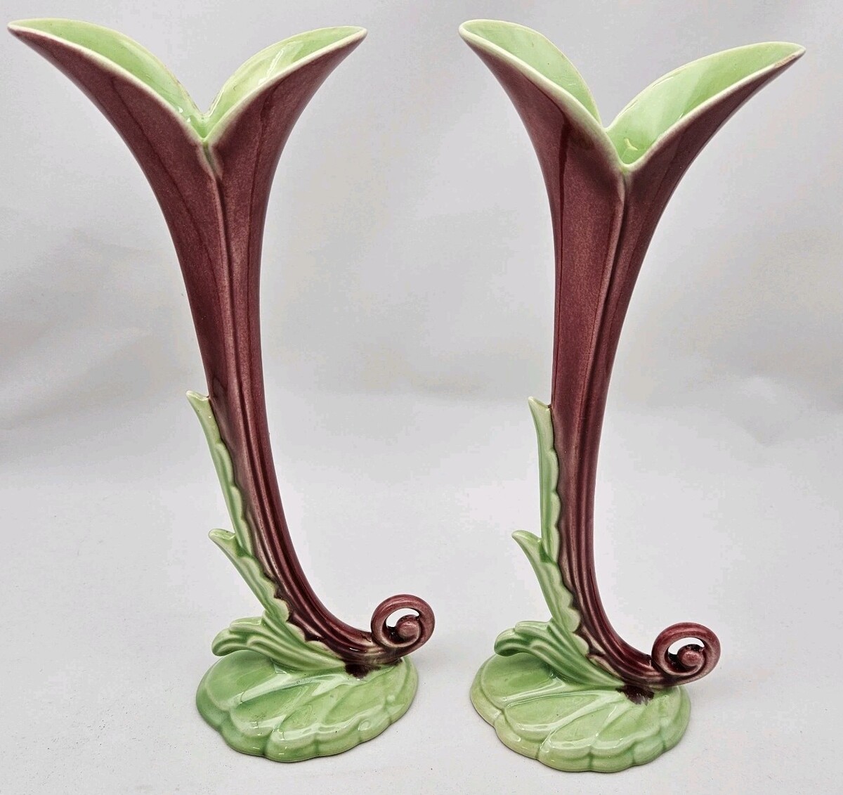 2 Vintage Cemar Bauer Vases Mid Century Bud Green/Pink Glaze Fluted Ceramic Vases