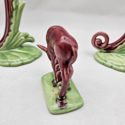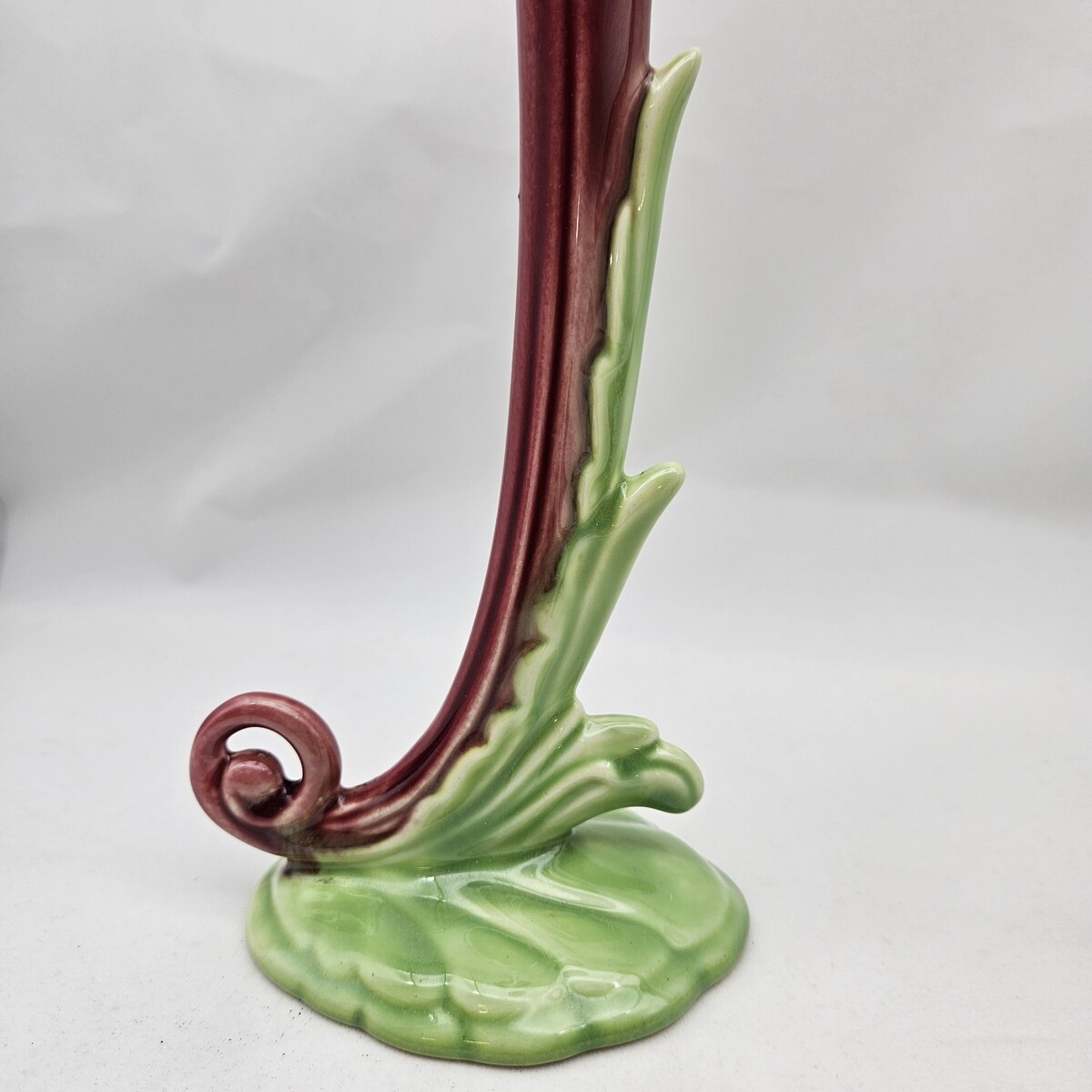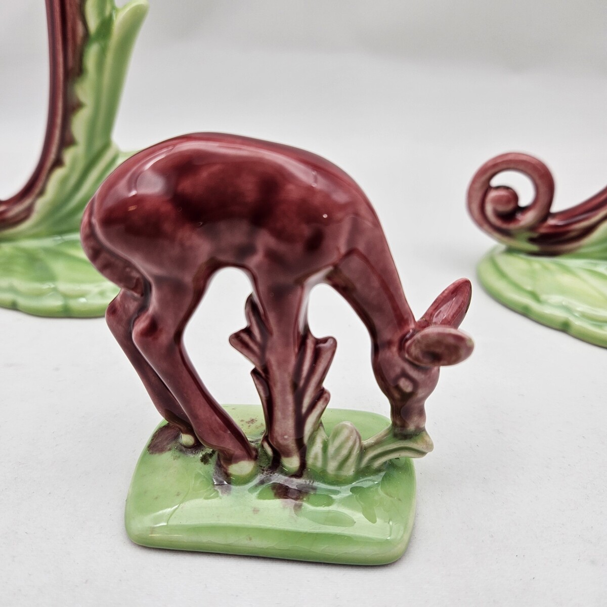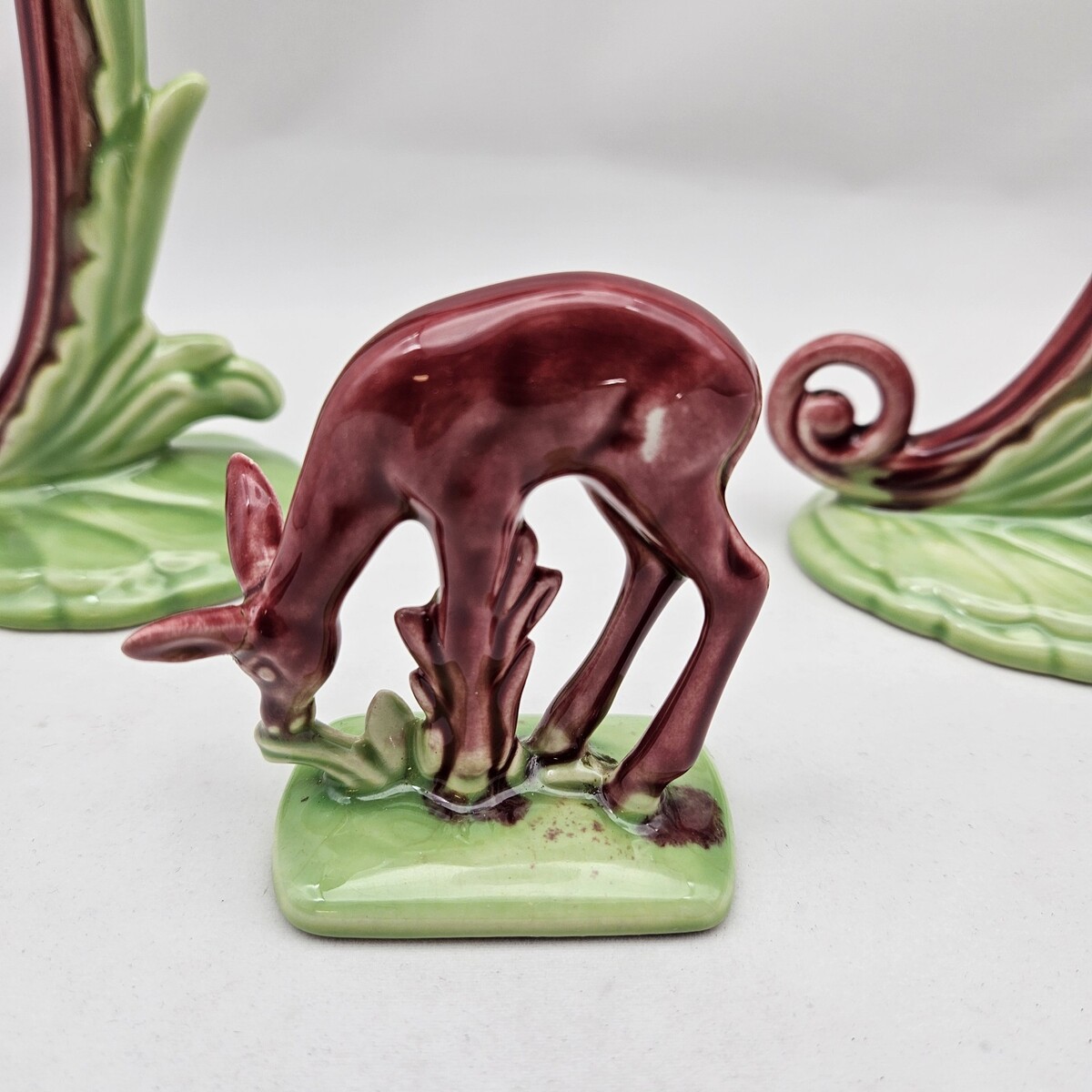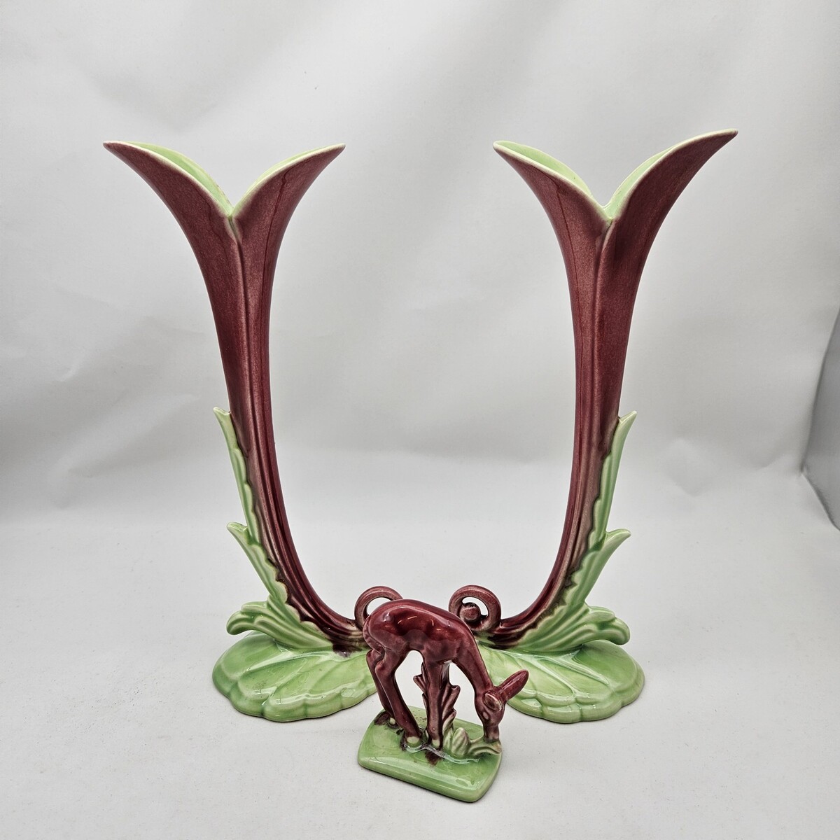 2 Vintage Cemar Bauer Vases MCM Bud Vase Green/ Pink Glaze With Deer