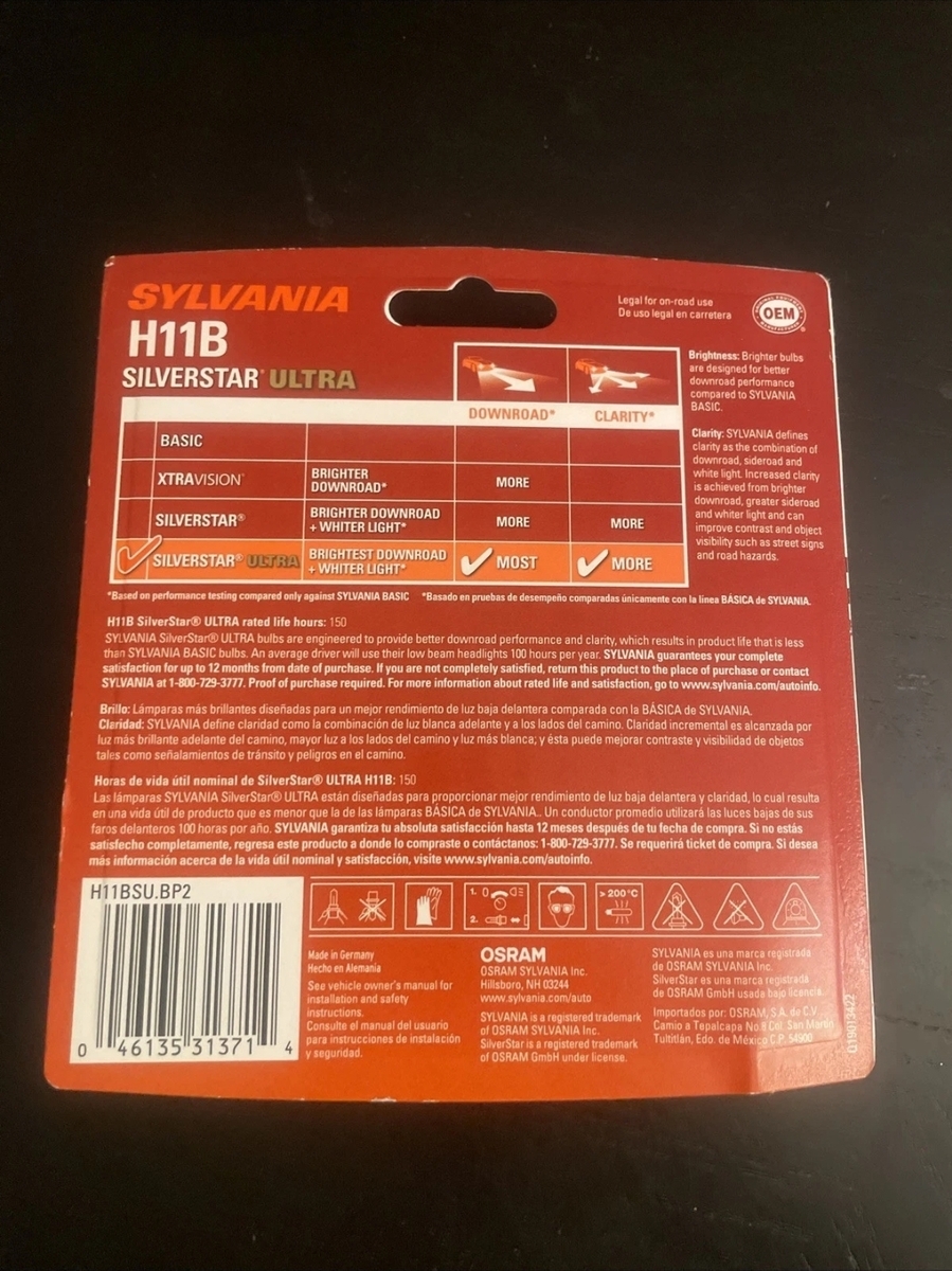 Add a sharper, brighter, more powerful light to the exterior of your automotive applications with the Sylvania H11B SilverStar Ultra White Halogen Headlight Bulb Set. This bulb set features state-of-the-art SilverStar Ultra technology that delivers head-turning, high-performance style, and safety for your vehicle. These high-performance halogen bulbs deliver the brightest and whitest light offered by Sylvania. The combination of the furthest downroad, sideroad, and white light improves your visibility on the road at night. The whiter than traditional light offers more clarity by increasing contrast, making it easier to see objects such as street signs and road hazards. Constructed with specially designed filament, propriety gas mixture, and a lamp coating that shifts the color temperature towards a whiter light. With patented tri-band technology, these bulbs instantly light up with a full-power design sure to give you and those around you more time to react while on the road. Prioritize your safety on the go and take car maintenance and upkeep into your own hands. The next time you replace your headlights, go with trusted, reliable bulbs in the Sylvania H11B SilverStar Ultra White Halogen Headlight Bulb Set.