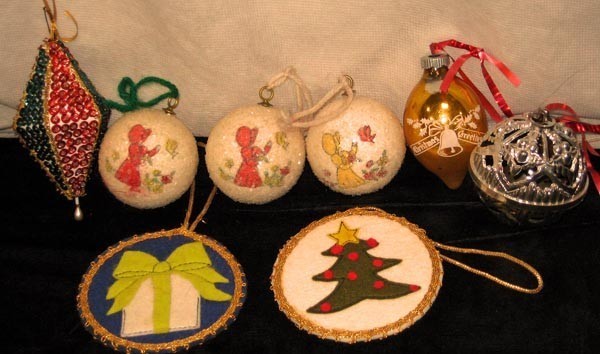 Vintage Christmas Ornaments Lot Of 8 Glass Stencil, Holly Hobby, Felt, Sequins