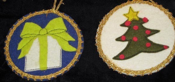 4. 2 Round Felt Applied Design Ornaments Multi Colored With Gold Cord Hangers 3 3/4" Round x 1/4" Thick