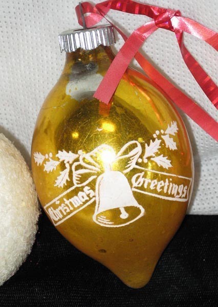 1. Mercury Blown Glass Stenciled Gold Teardrop Ornament With Christmas Greetings Stencils 3" Tall x 2" Wide