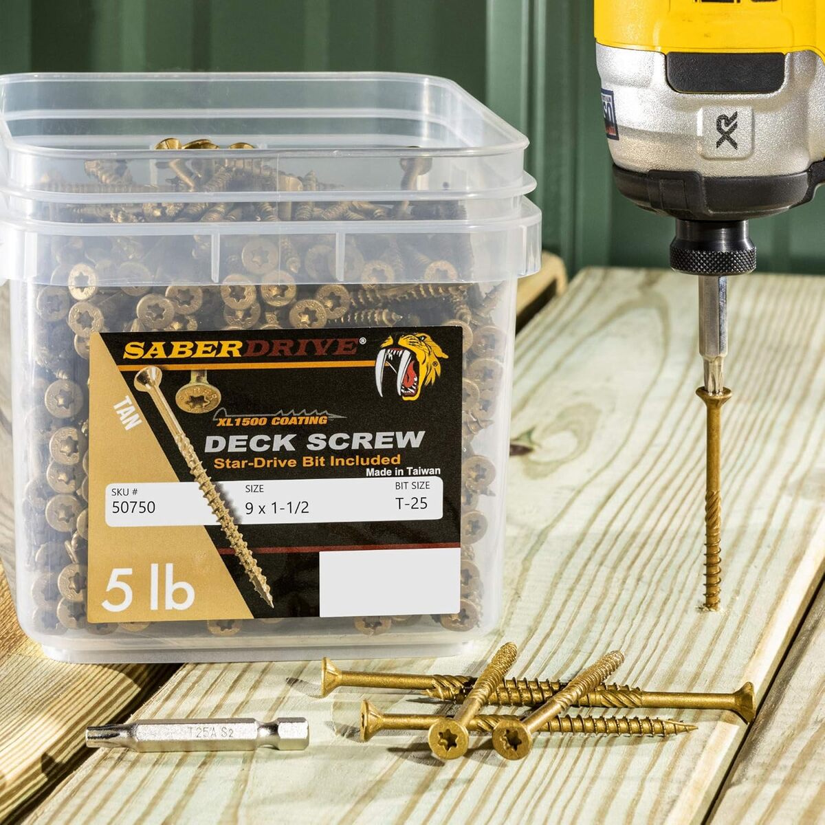 Saberdrive Tan XL1500 Coated Exterior Star Drive Multi-Purpose Deck Screws, 5lb, Approx. 764 Pieces - #9 x 1-1/2" Screws with Protective Coating, Decking Screws for Construction, Repair