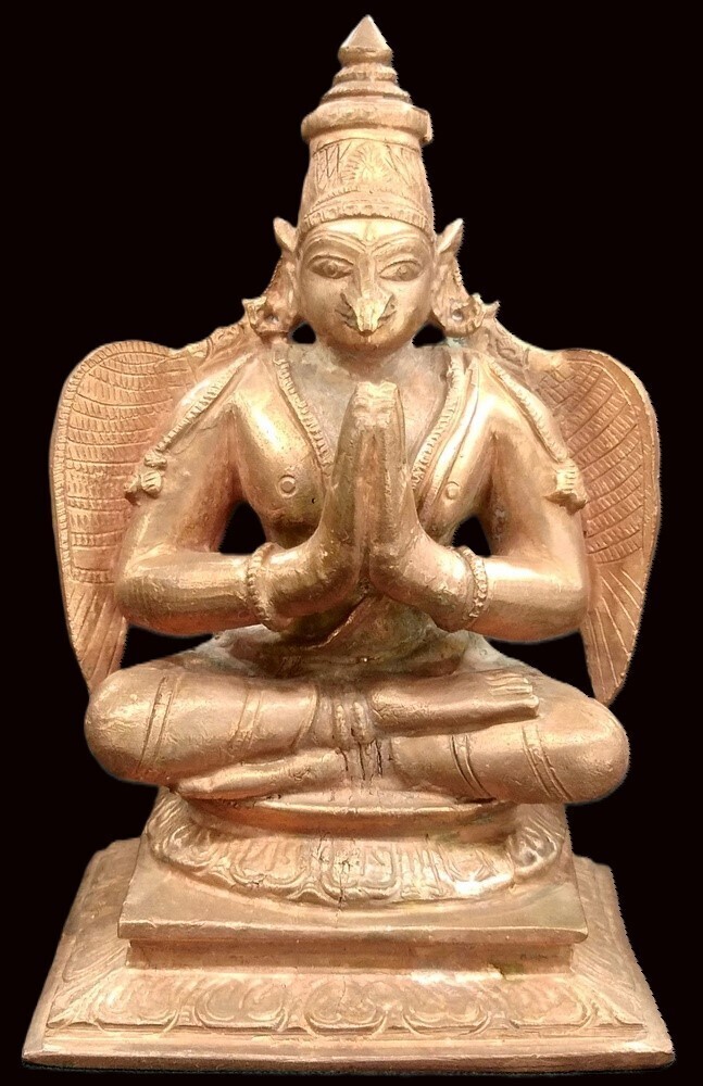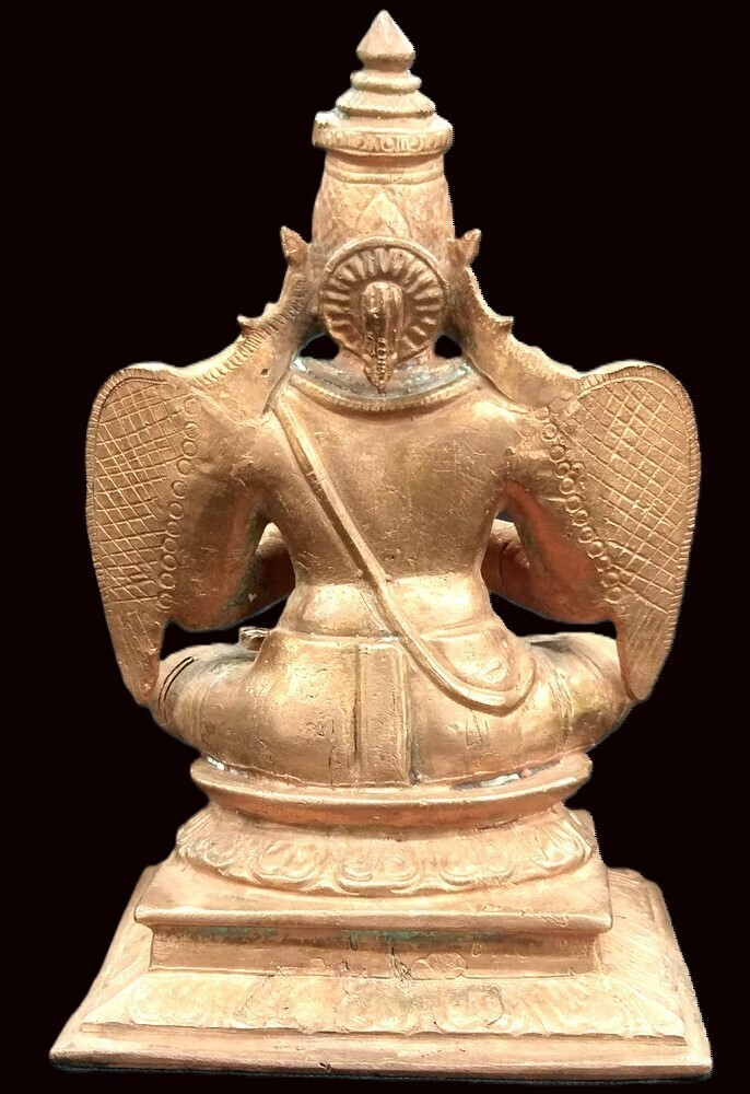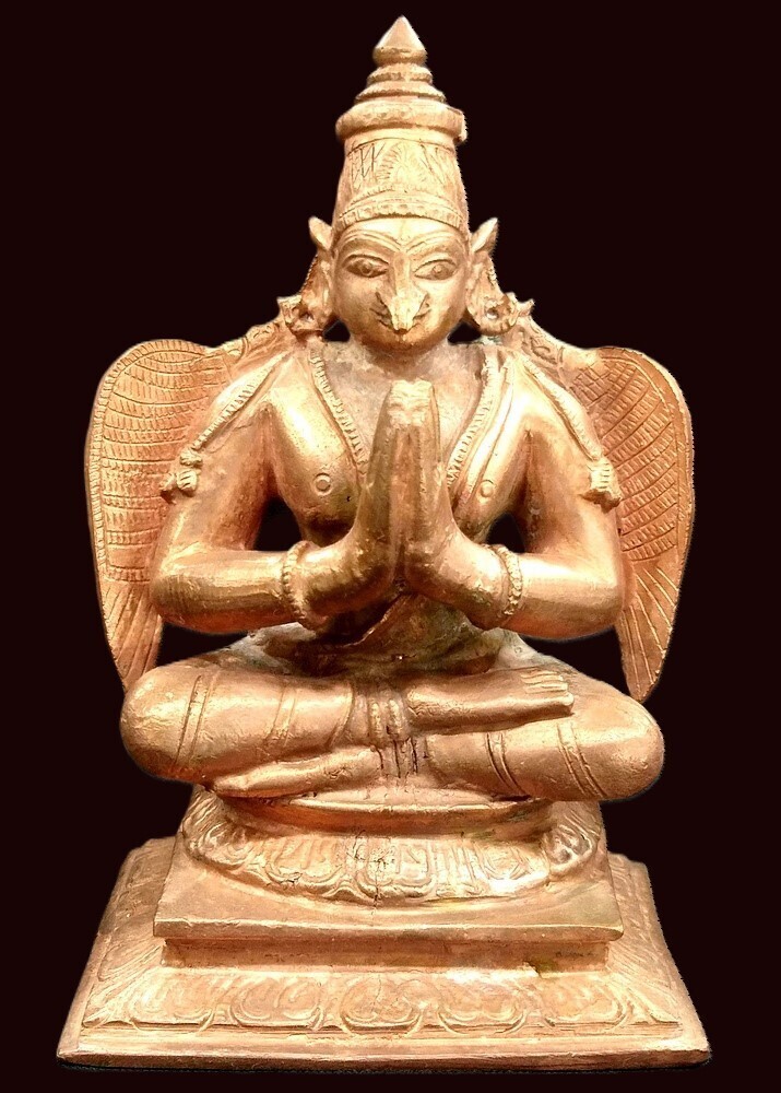 In this beautiful carved sculpture in solid copper by south indian artisians , His beautiful sharp wings are relaxed. The beautiful face having both human and garuda beak make this piece truly an inspiring piece. The details on the wing and the entire piece are abundant . The beautiful illustration of clothing and ornaments enriched with brilliant radiance add to the exquisiteness of the Idol.