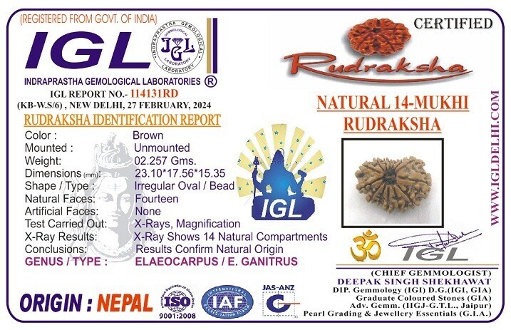 If a man always wears on his head or arm a Rudraksha with fourteen mouths, the mass of Sivas?s power, he is always honored and approached by gods due to the greatness of this religious merit Sacred Hymn for the 14 Mukhi Rudraksa is OM NAMO NAMAH