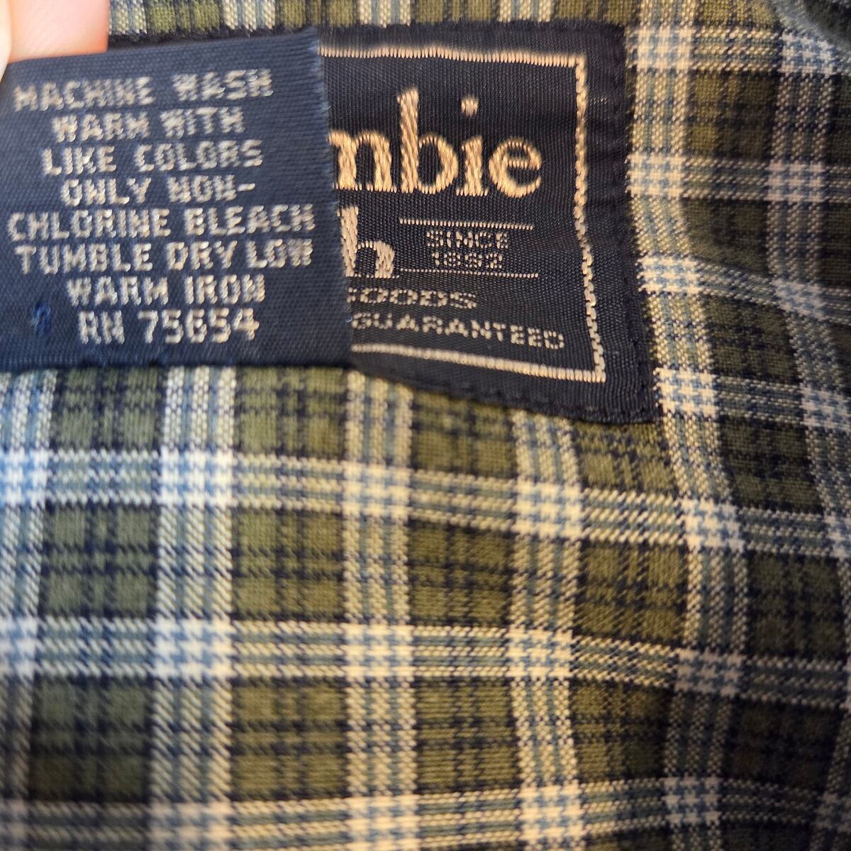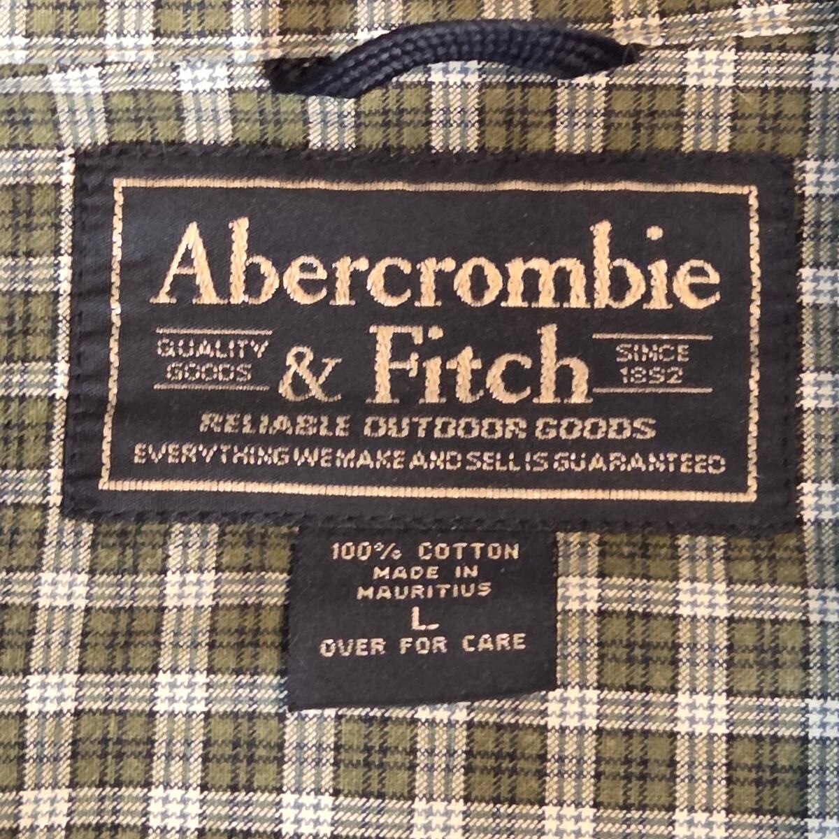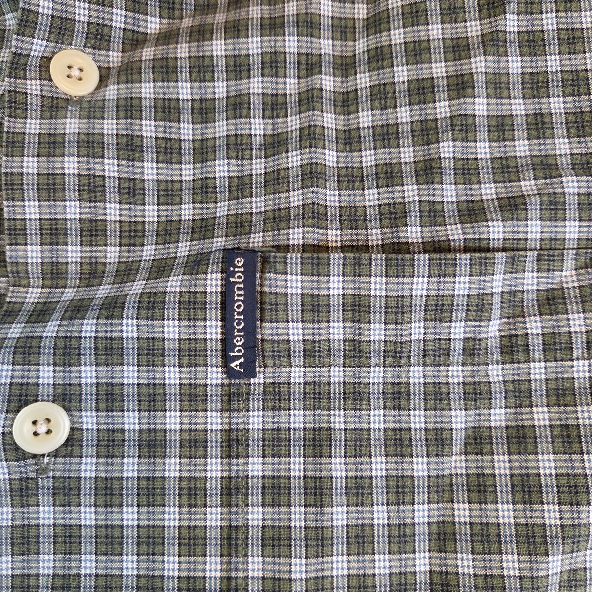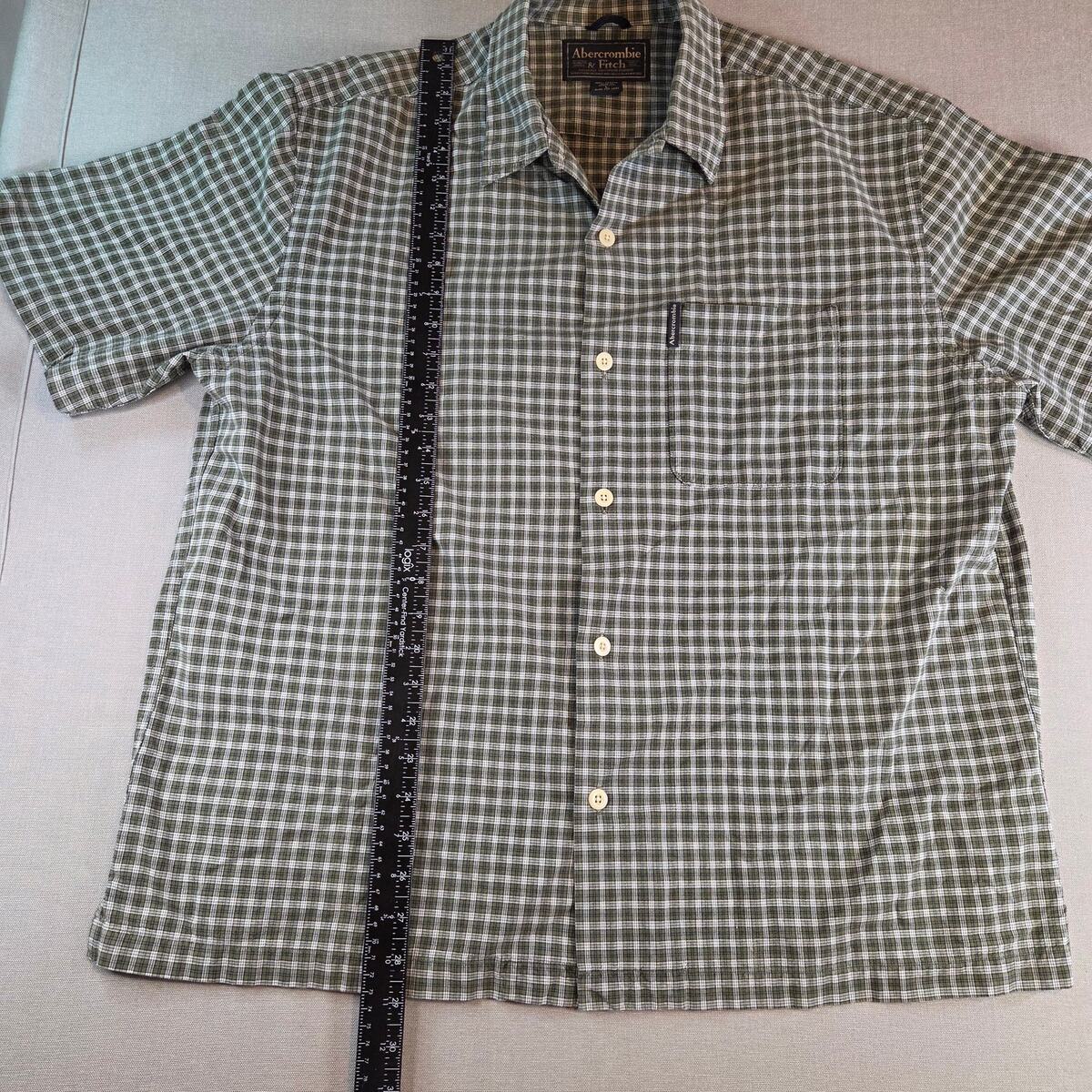Abercrombie Fitch short sleeve button-down shirt in a green/gray check plaid pattern. Made of 100% cotton, this men?s size Large shirt was manufactured in Mauritius. A classic early 2000s Abercrombie piece, ideal for casual everyday wear.