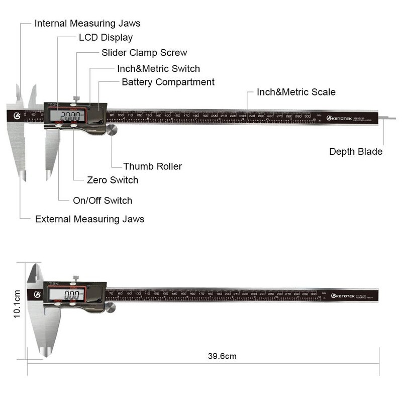 ?Precise and Accurate?KETOTEK digital caliper 12 Inch has a measurement range of 0~12"/0~300mm, accuracy to 0.001?/0.02mm and resolution to 0.0005"/0.01mm. 2 LR44 batteries included, mini screwdriver and custom fit storage case included for better value.
