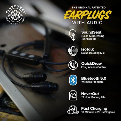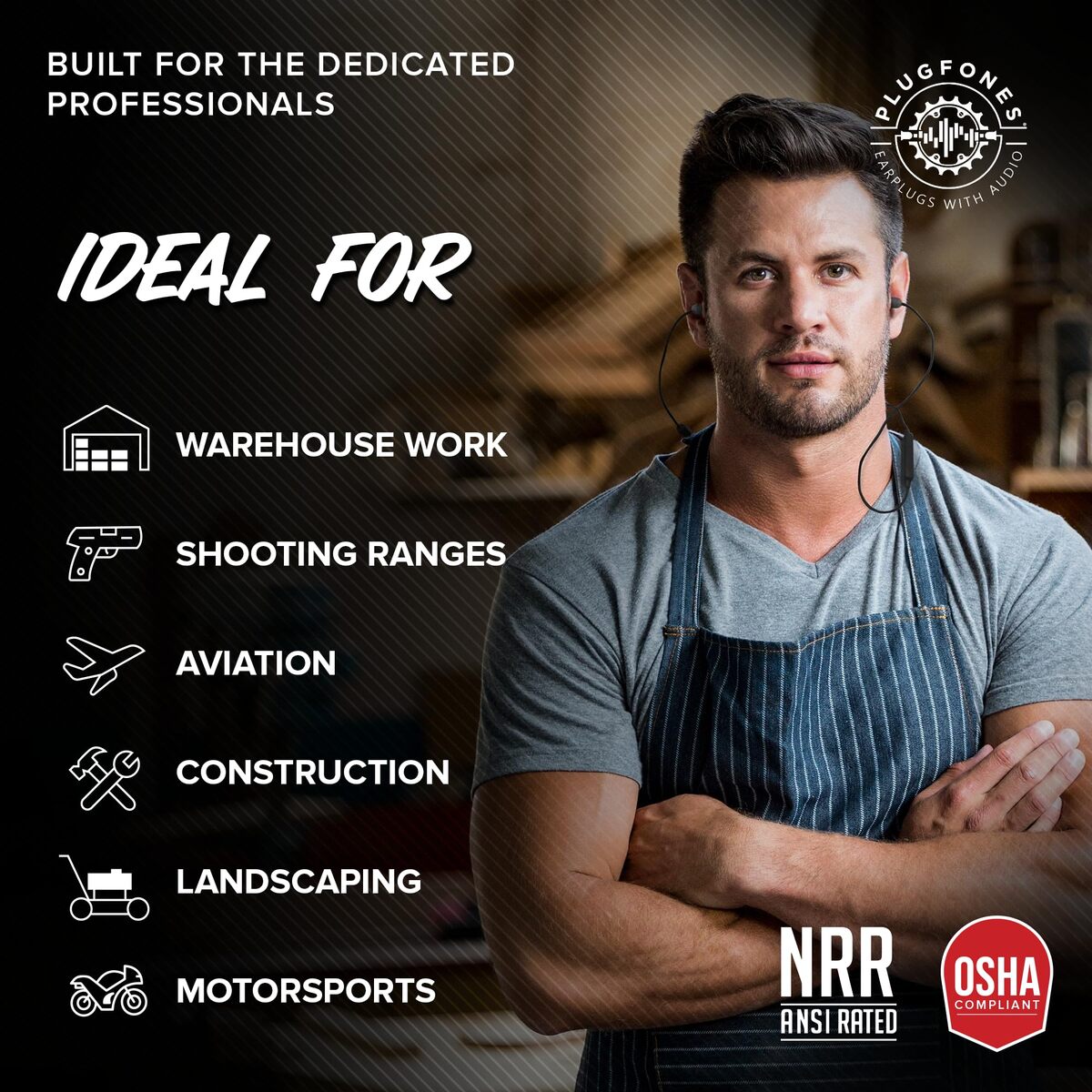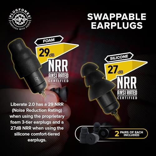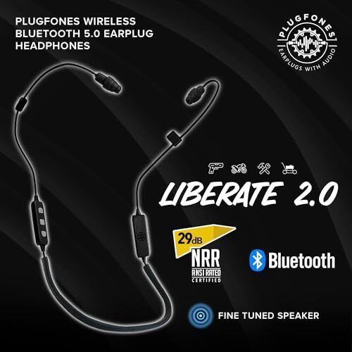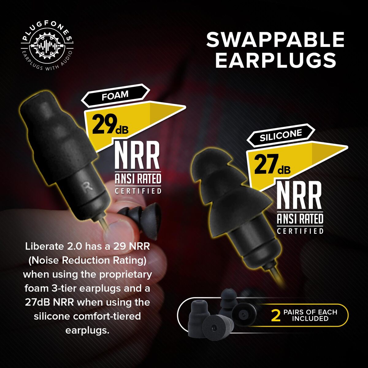 Product description: Introducing the Plugfones Liberate 2.0--WHERE EARPLUGS MEET EARBUDS. We?ve combined comfortable, noise-reducing earplugs with high-quality audio speakers. The resulting hybrid provides the ultimate hearing protection and wireless listening experience on the market. At Plugfones, we believe that work should be enjoyed--so we created an earplug-earbud product to help you do exactly that. Plugfones allow you to hear outside low-level noises while listening, so they're great for any loud environment you find yourself in--working out at the gym, DIY-ing in the workshop, shooting at the range, or traveling via motorcycle or plane. The Liberate 2.0 has Noise Reduction Ratings (NRR) of 23 and 26 dB (depending on the plugs used), which protect your hearing while letting you to listen to your music. It features the IsoTalk Noise Isolating Mic that helps reduce noise when speaking and the Quickdraw Easy Access Control for managing music and calls. As the most unique and effective earplug-earbud hybrid, Plugfones are engineered to last with a flexible wire casing. With interchangeable foam and silicone plugs, tuned speakers, and SoundSeal Noise-Suppressing Technology, they help you get in the zone and stay there. Because comfort is key, our products are designed to fit all ear types, keep you irritation-free, and be worn for hours at a time. Each set includes the Liberate 2.0 wireless earplug-earbud hybrid, two pairs of ComforTwist Foam Plugs, two pairs of ComfortTiered Silicone Plugs, nylon zipper case, cable management clip, Micro USB to USB charging cable, and quick start guide. Bluetooth Plugfones come standard with a 180-day limited warranty. Plugfones are independently tested and compliant with ANSI S3.19-1974 noise reduction standards and meet NIOSH criteria. CHOKING HAZARD: Not suitable for children under the age of 3.