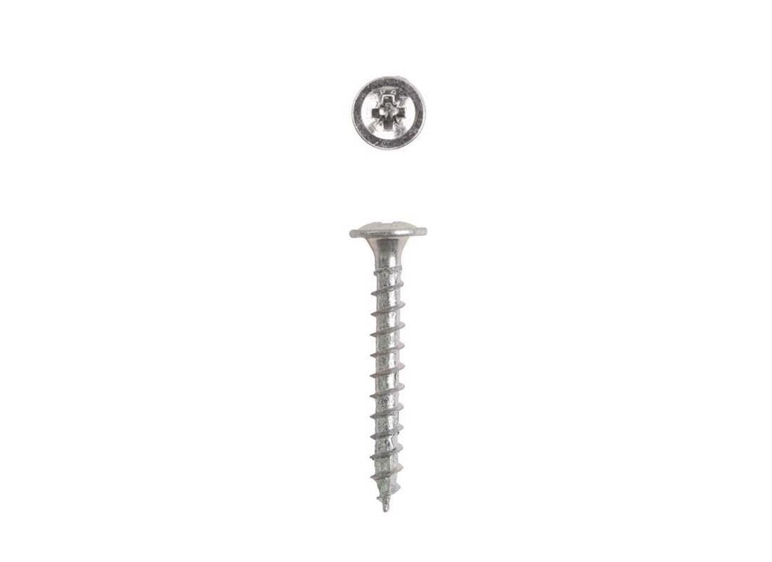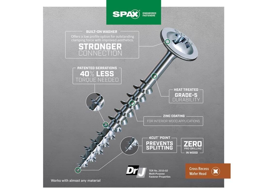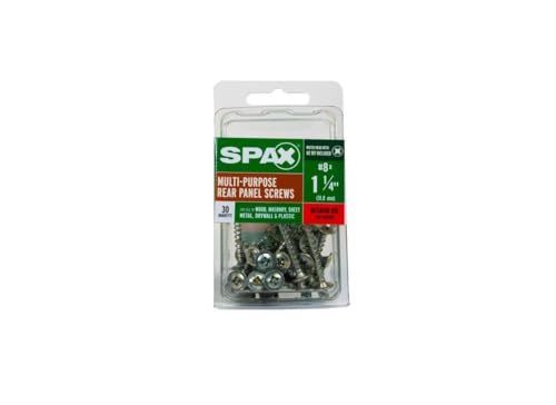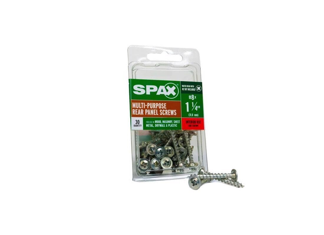 Bullet point: Brand Name: SPAX Callout Size: No. 8 Length: 1-1/4 in. Drive Style: Phillips/Square Finish: Zinc-Plated Product Type: Multi-Material Screw Number in Package: 30 pk Indoor or Outdoor: Indoor Thread Type: Serrated Material: Carbon Steel Packaging Type: Clamshell Head Type: Wafer Head Self Drilling: No Thread Style: Fully Threaded Head Size: 0.375 in.