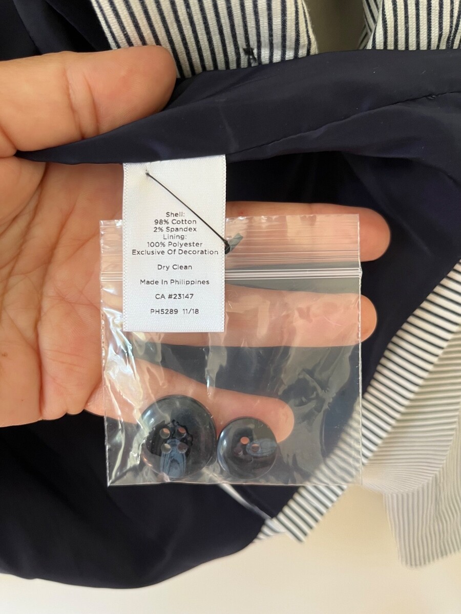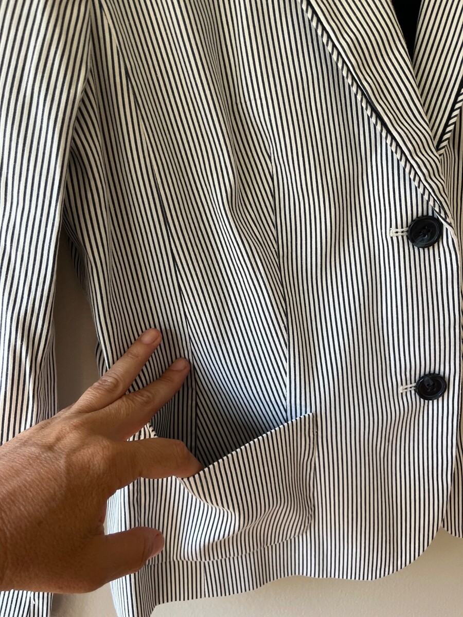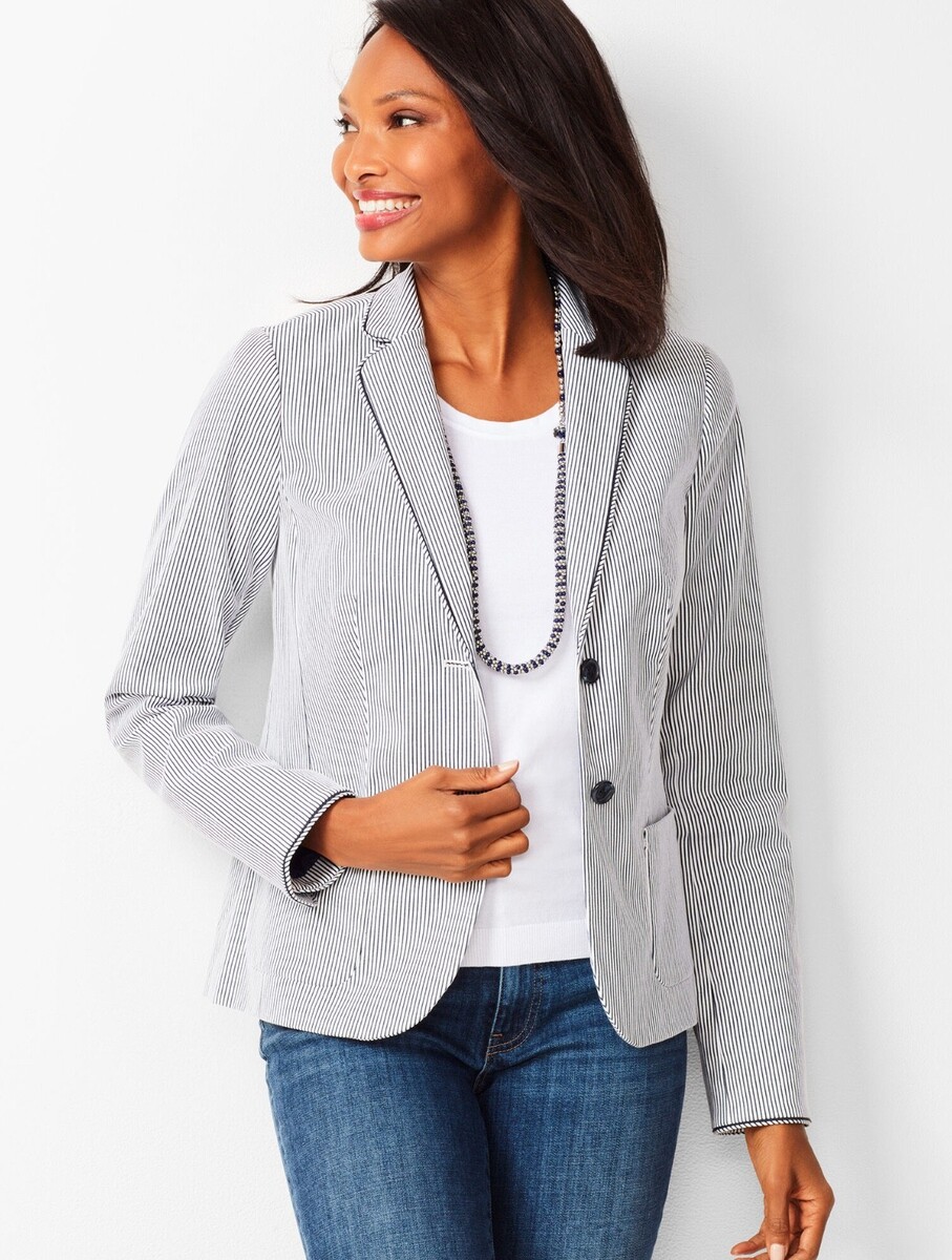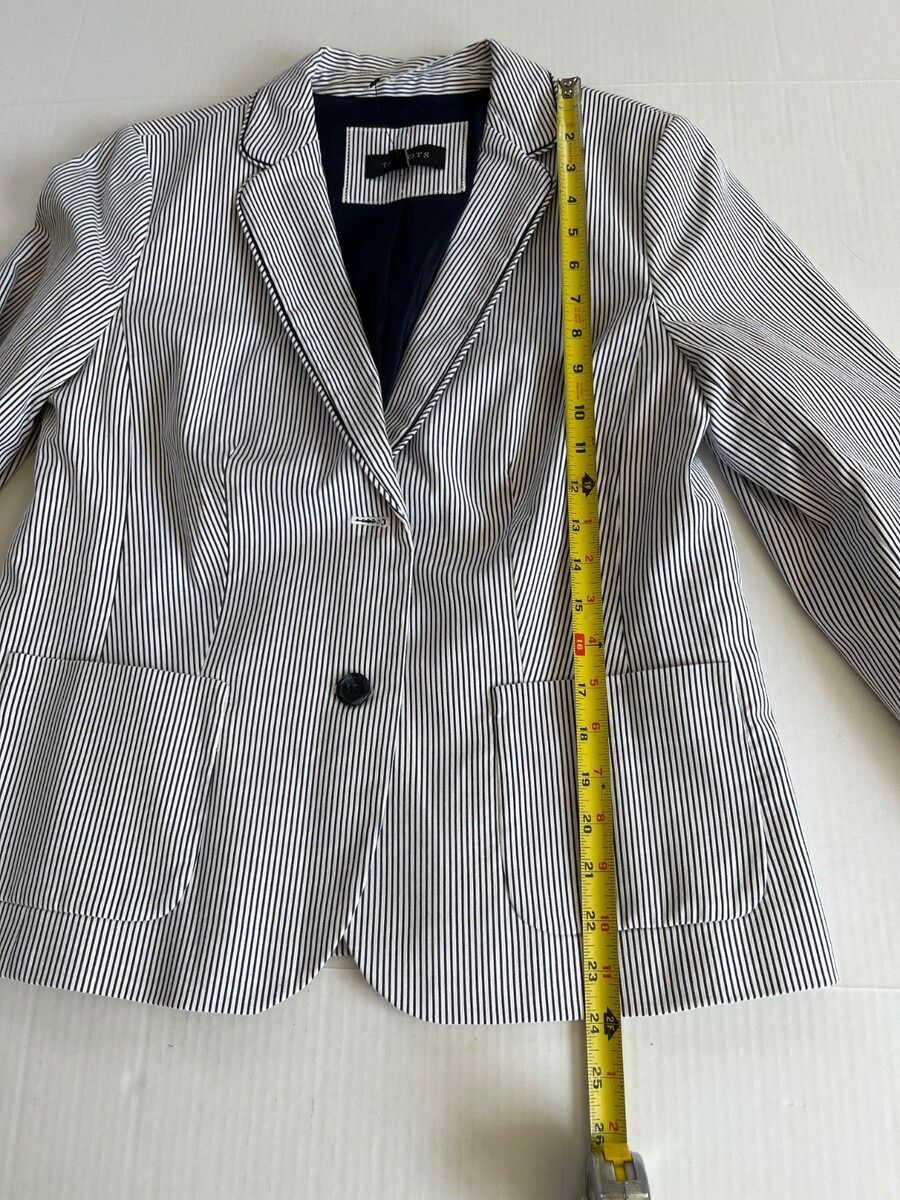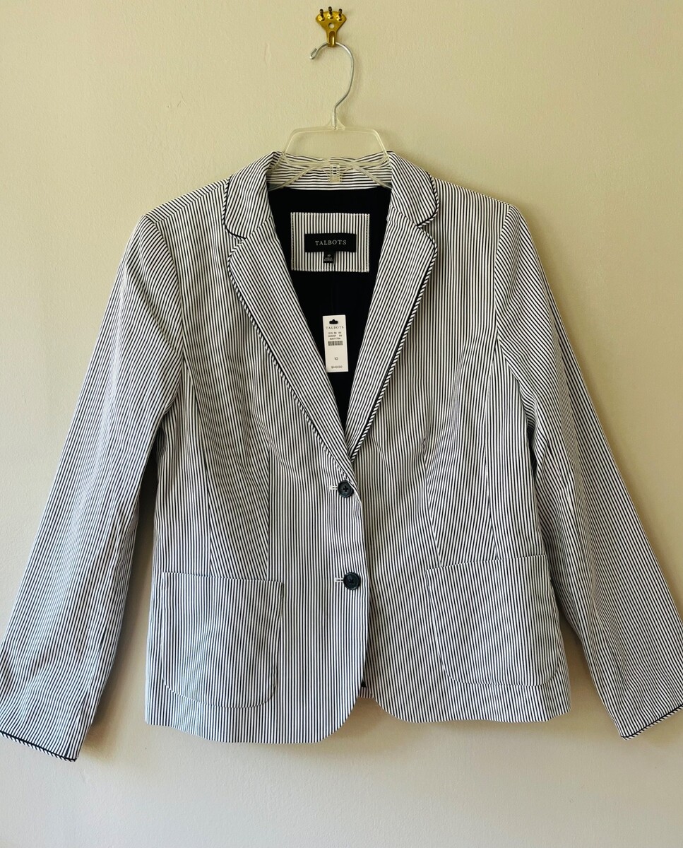Talbots Sz 10 Navy White Striped Piped Blazer Jacket Patch Pockets Fully Lined