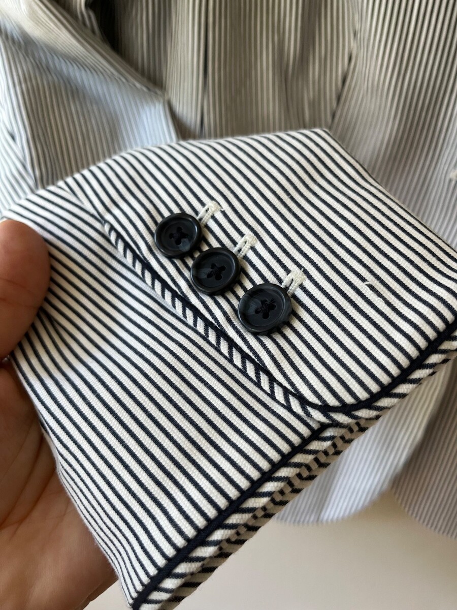Special touches include a faux-horn front button, functional cuff buttons, and piping along the collar and cuffs.
