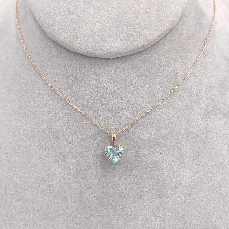 A 14k rose gold pendant featuring a heart shape light blue aquamarine gemstone. The aquamarine weighs 1.73 carats and measures about 8.5mm x 7.7mm. The pendant measures 1/2" long with bail and includes a new 14k 18" chain. The necklace weighs 1.27 dwt. and is new. Charming!
