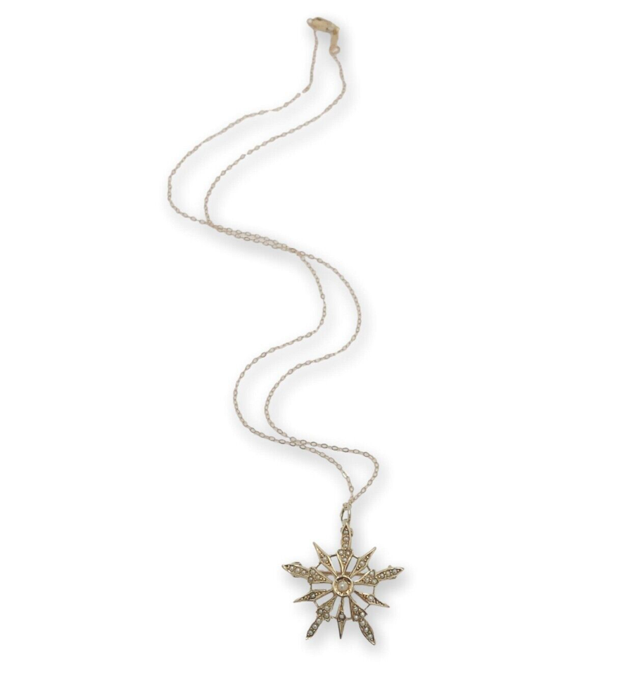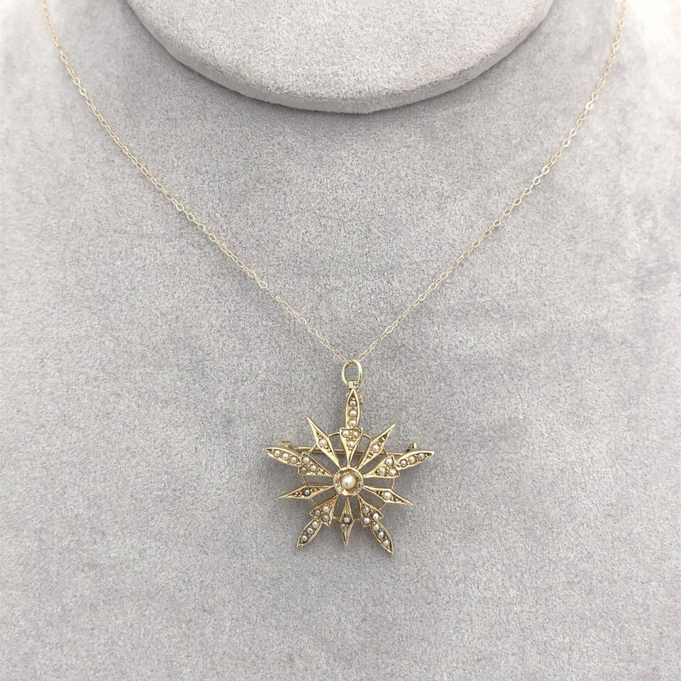 14k yellow gold brooch in a starburst design that is set with about thirty-six seed pearls. There is a fold down bail to be worn as a pendant. It measures 1" in diameter or 1 1/8" with bail. The necklace with chain weighs 2.88 dwt. It dates from the 1890s with a new 18" 14k chain. Captivating!