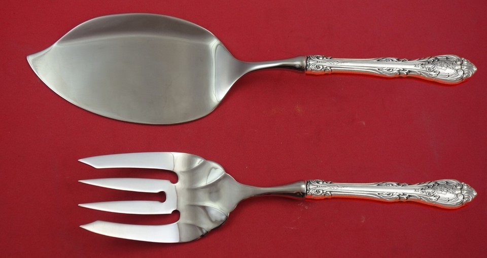 Sterling silver hollow handle with stainless implement Salmon Serving Set 2-piece custom made in the pattern King Edward By Gorham. This set includes two versatile serving utensils: