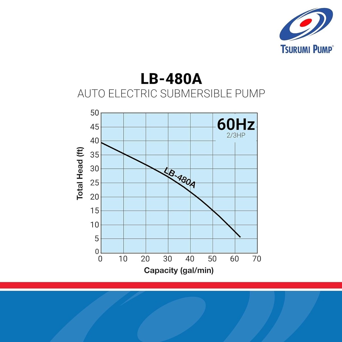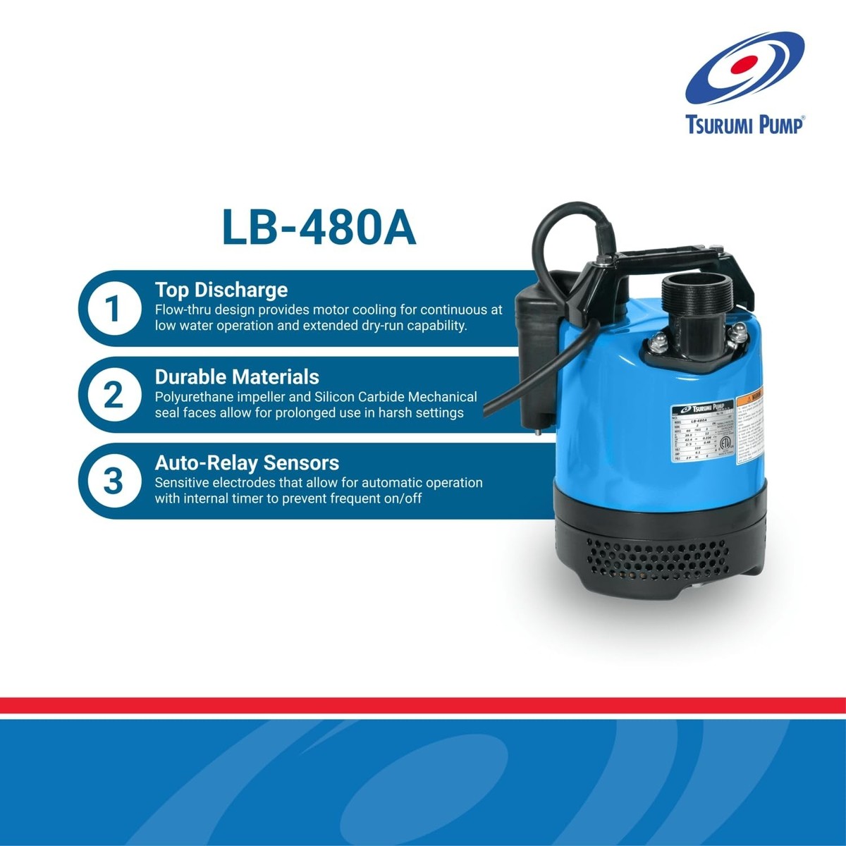 Tsurumi Pump LB-480A Submersible Dewatering Pump with Auto Relay Switch 2/3 HP 115V 2" Discharge for Construction Dewatering | 63 GPM / 3780 GPH