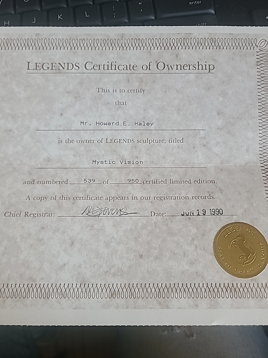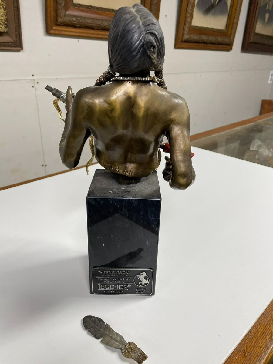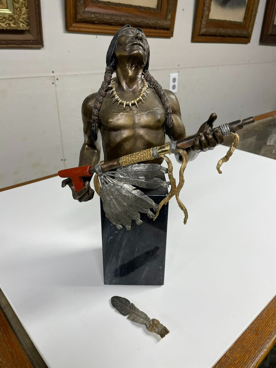 We are selling our dad's LEgends Bronze Sculpture series - This is the only one with damage, the feather has fallen off. It is included for you to repair the bronze