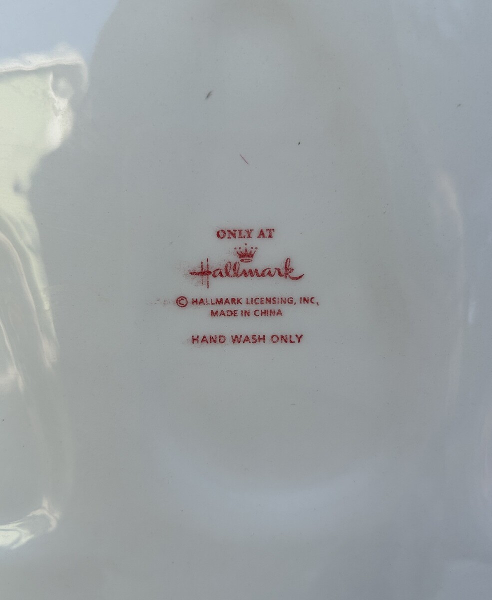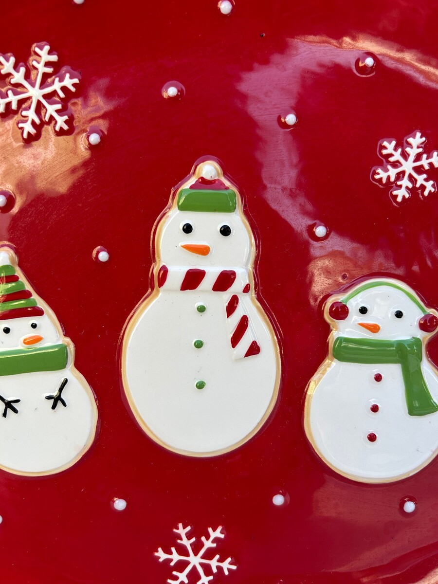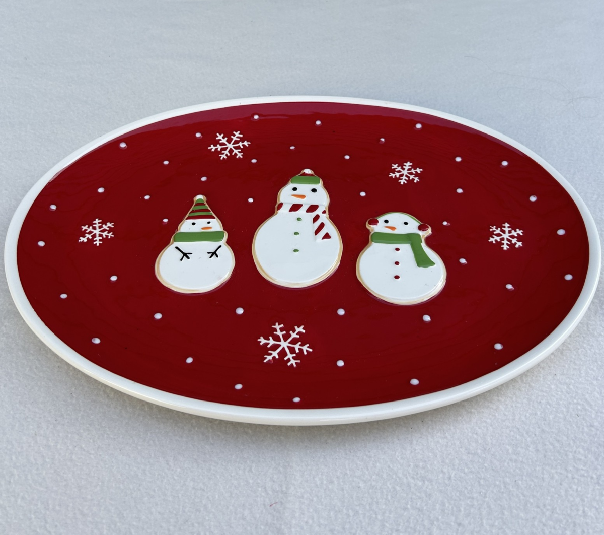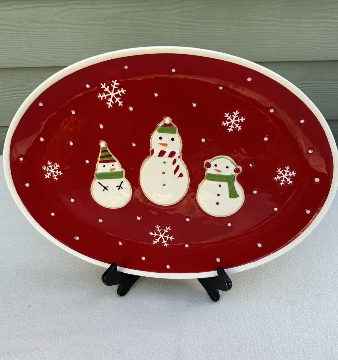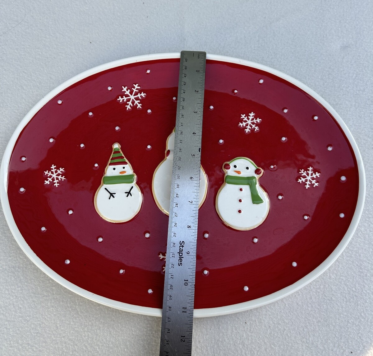 Discontinued Hallmark festive holiday platter, bright red oval with embossed snowmen and snowflakes, 15 1/2" x 11 1/2", no chips, scratches or cracks.