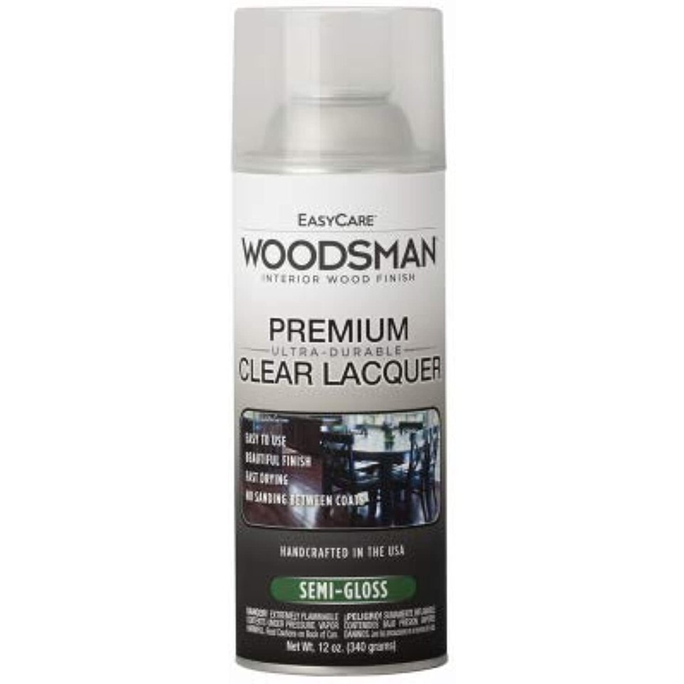 LQ23-AER, Easycare Woodsman, 12 OZ, Clear Spray, Semi-Gloss, Lacquer, Protective Finish For Wood and Metal, Dries To The Touch In 30 Minutes, Ensuring A Smooth, Dust Free Finish, Requires No Sanding Between Coats, Great For Woodwork, Cabinets, Furniture and Doors.