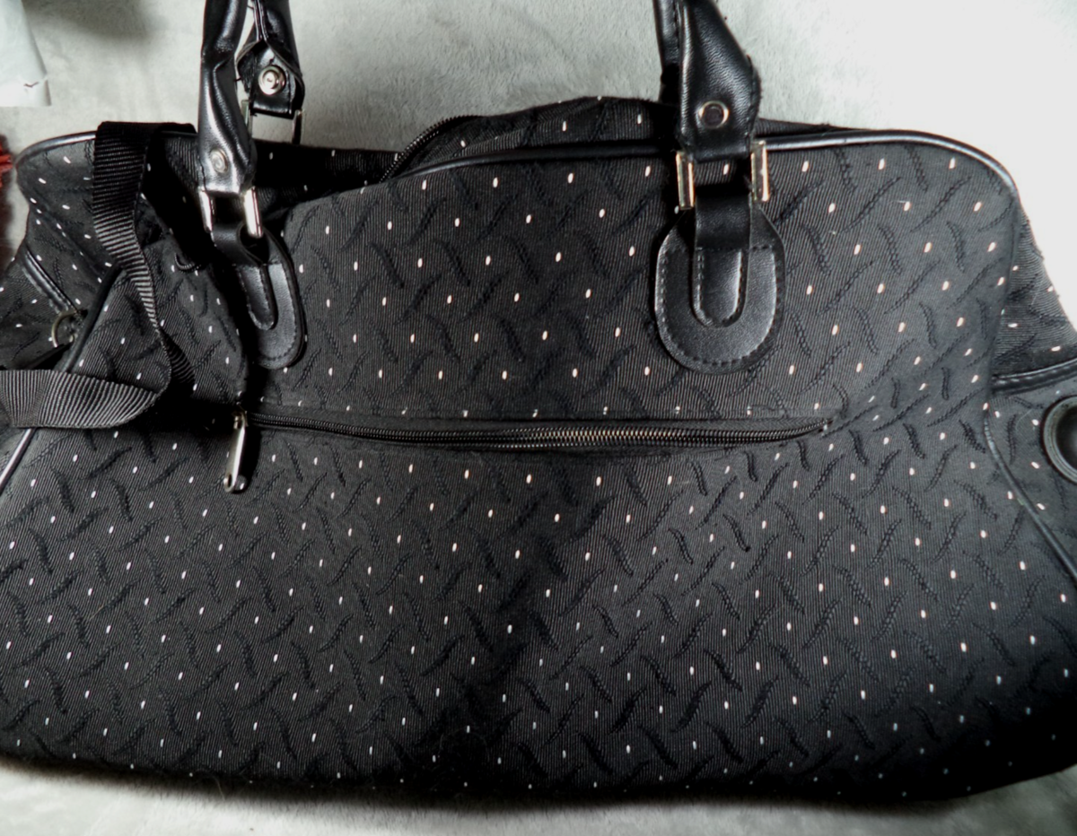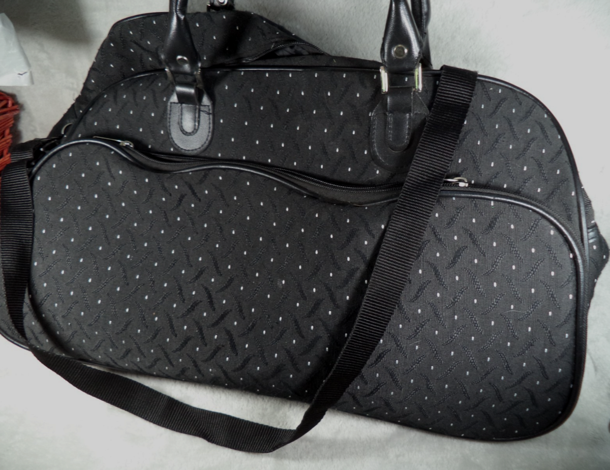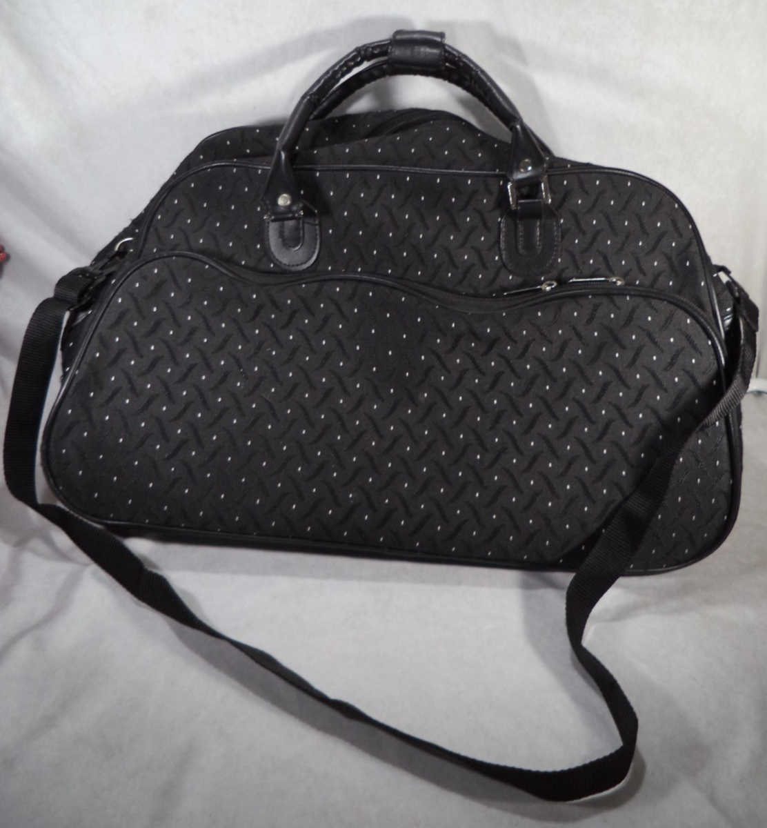 Description: The Duffle Bag Rolling Wheeled Trolley Bag is a stylish and practical travel suitcase featuring a polka dot pattern in black and white. This 20" tote carry on luggage is made of durable polyester material and includes convenient features such as lightweight design, accessory compartment, wheels for easy rolling, washability, locking functionality, and water resistance. Suitable for both men and women, this versatile suitcase is designed for comfortable travel and efficient transport of your belongings.