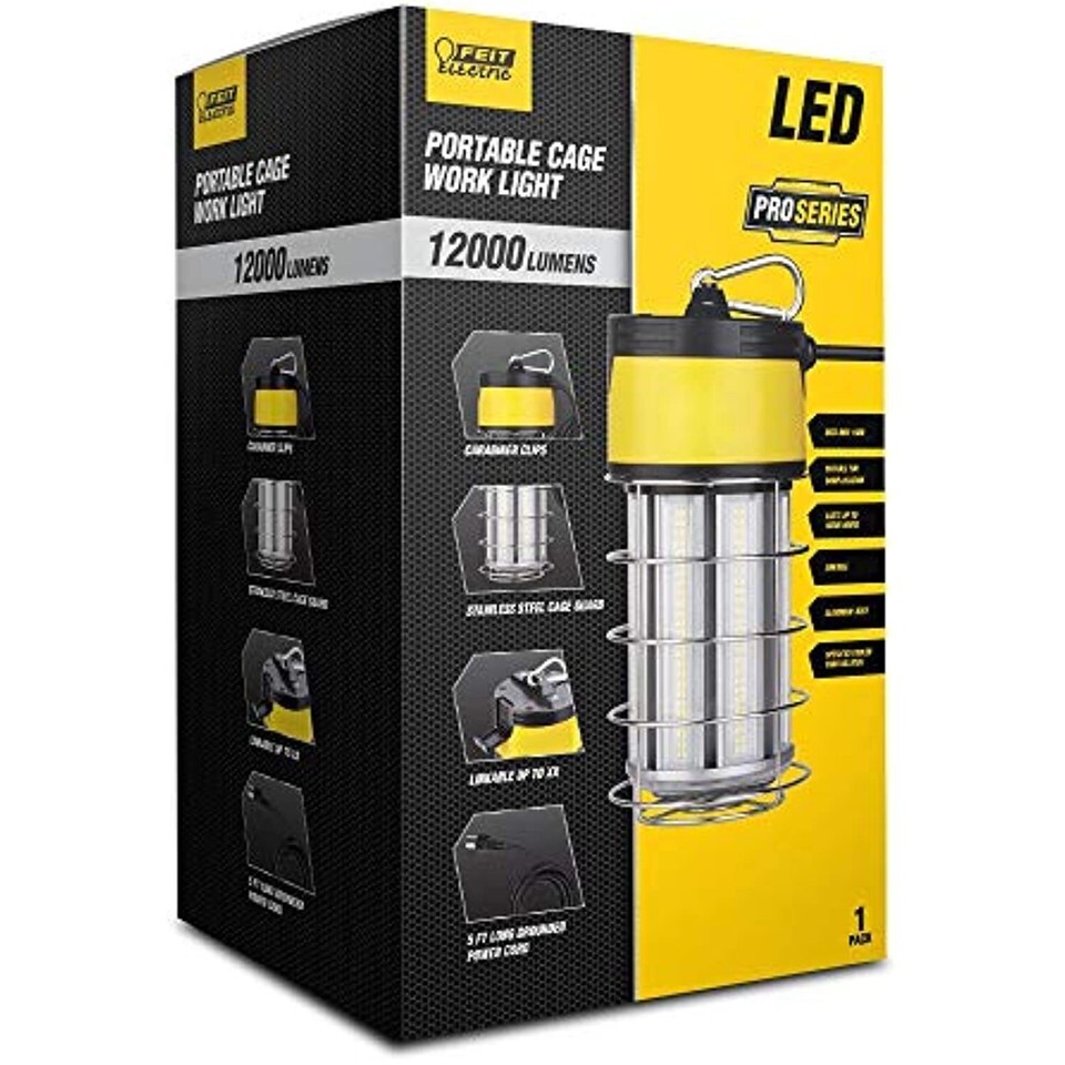 Light up the worksite with the Feit Electric WORKCAGE12000PLUG work light. Designed in a compact lantern shape, this light outputs a superbright 12,000 lumens of 5000K Daylight color temperature light while using only 100 watts of energy. Durably constructed, each lantern comes with a stainless steel cage guard and can last up to 50,000 hours. Link up to 6 lanterns together for wider area coverage. Choose a Feit Electric work light for your portable lighting needs.