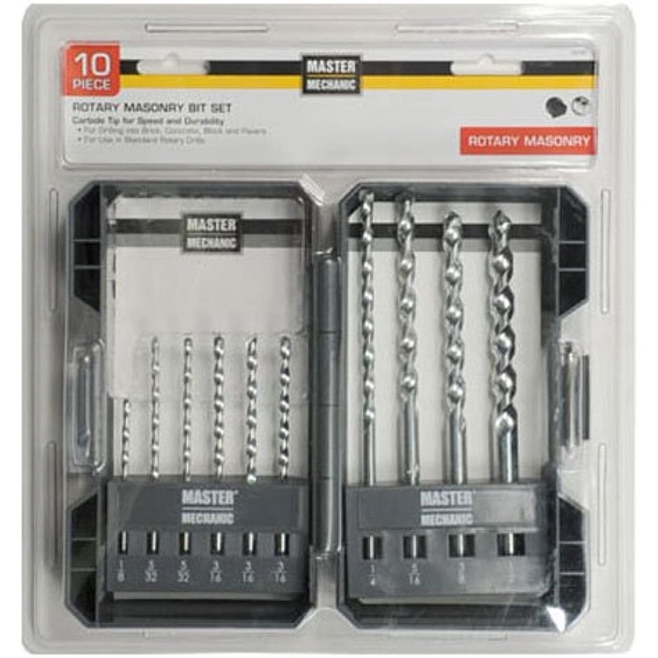 Master Mechanic, 10 piece, rotary masonry drill bit set, carbide tip geometry for speed durability, for use on standard drills, includes: 3/16", 1/8", 2-5/32", 2-3/16", 1/4", 5/16", 3/8" 1/2", organized in a durable case, Clamshell.
