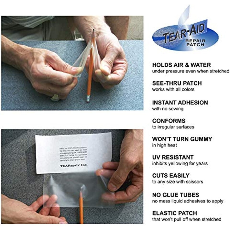 The TEAR-AID patch is see-thru to work on any color and is UV resistant to prevent yellowing for years. It provides instant adhesion with no sewing, NO GLUE and no mess. The patch also conforms to irregular surfaces and won?t turn gummy in high heat