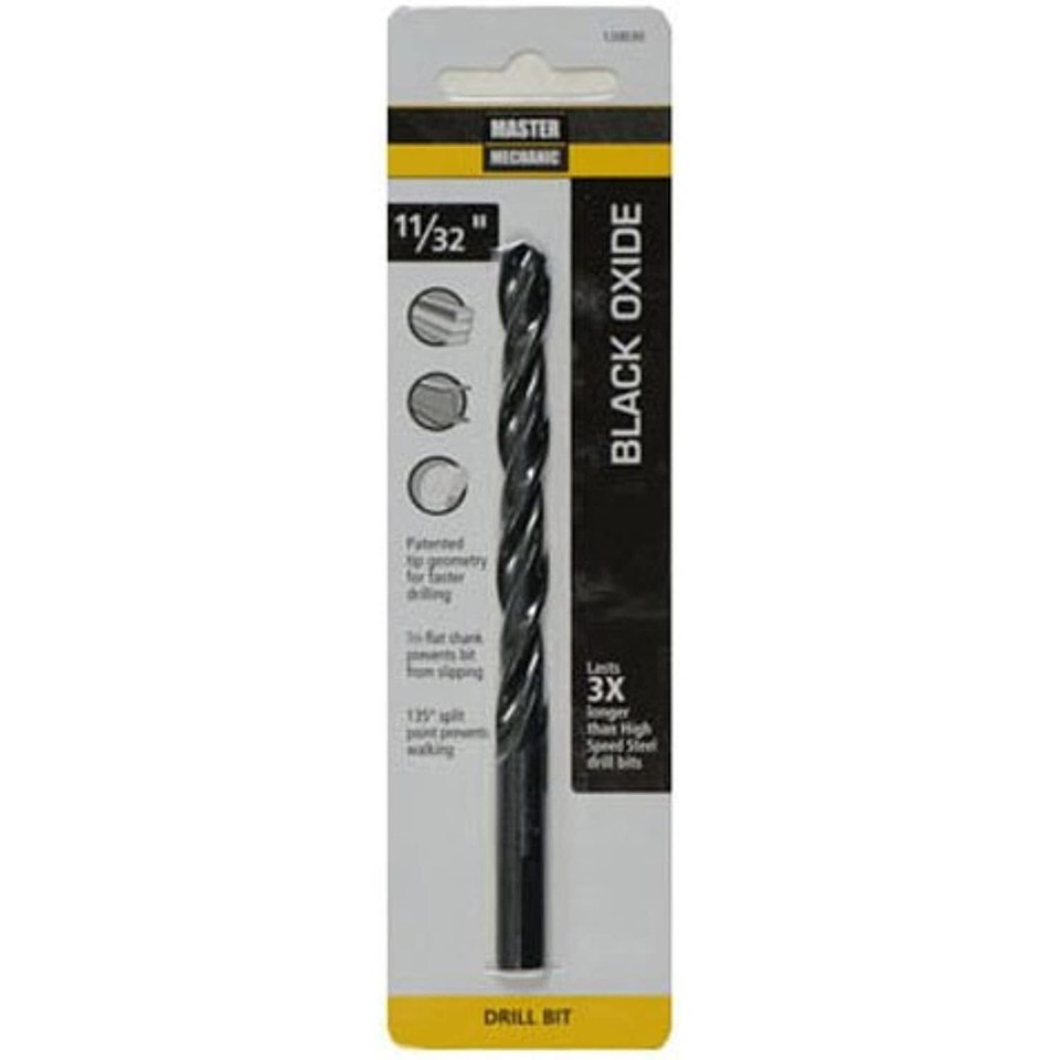 Master Mechanic, 11/32" x 4-3/4", high speed steel, BLACK oxide drill bit, 135 split point, jobber length, straight shank, 135 point angle with 4 cutting edges which eliminate walking provide fast penetration, BLACK oxide tempering treatment reduces Frictional resistance improves chip flow, recommended for wood, plastic, Wallboard, plywood soft metals, aluminum, brass bronze, for occasional use in stainless steel other hard metals, Carded.