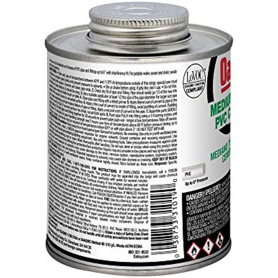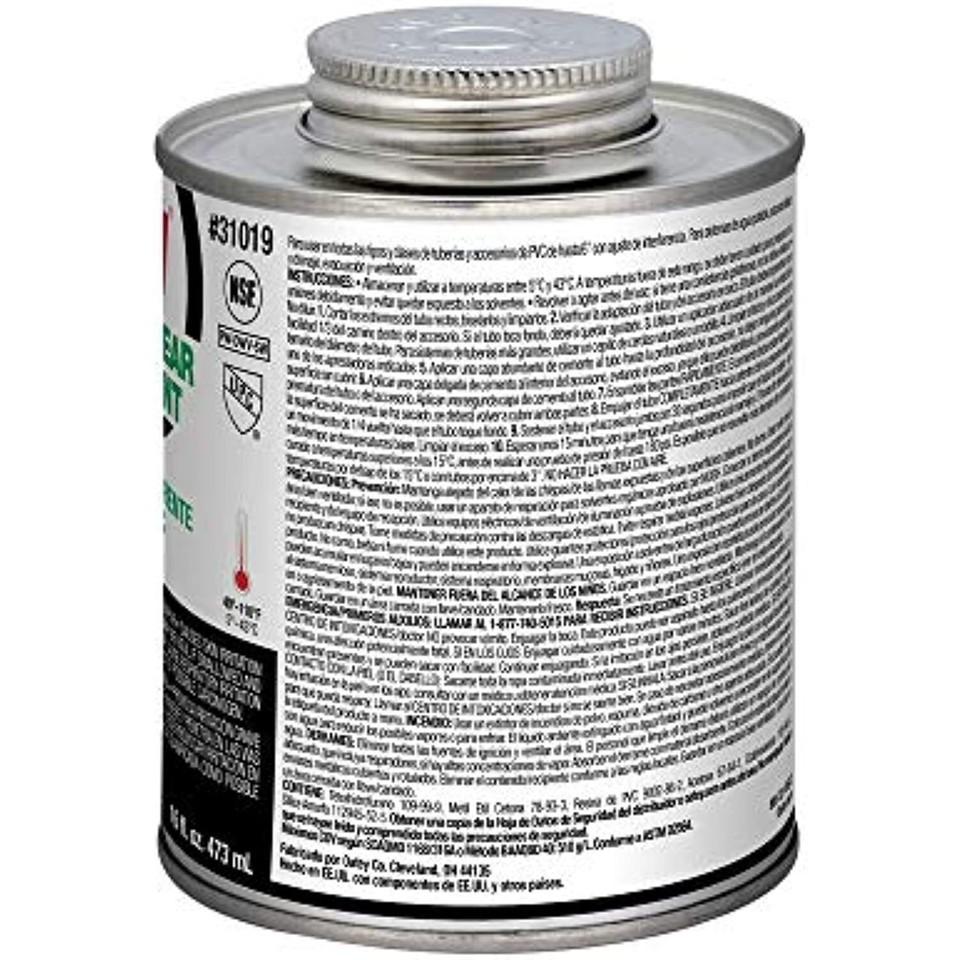 Product Description Oatey 31019 PVC Medium Cement, Clear, 16-Ounce From the Manufacturer Oatey products can be found in residential and commercial applications and have achieved excellent brand name recognition with consumers. All products are backed with the highest quality technical and customer support programs in the industry